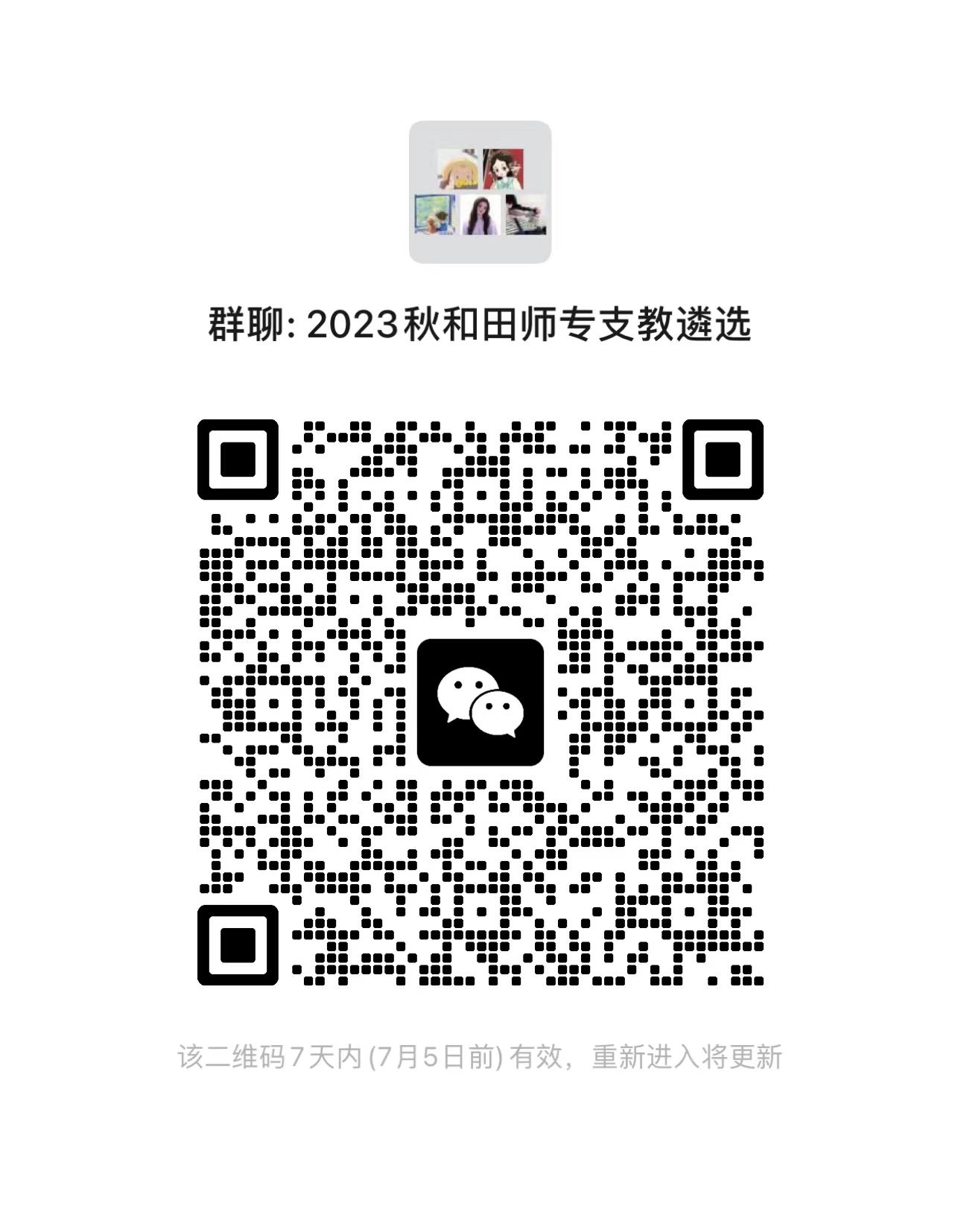 有意参加顶岗支教的研究生同学,报经导师、辅导员和所在培养单位分管领导同意后,于6月30日(星期五)16:00前将《betway西汉姆联和田师专研究生顶岗支教项目报名表》纸质版(需签字盖章)提交至党委研究生工作部管理科(研究生院102办公室),并扫描下方二维码加入微信群以接收后续遴选工作通知。