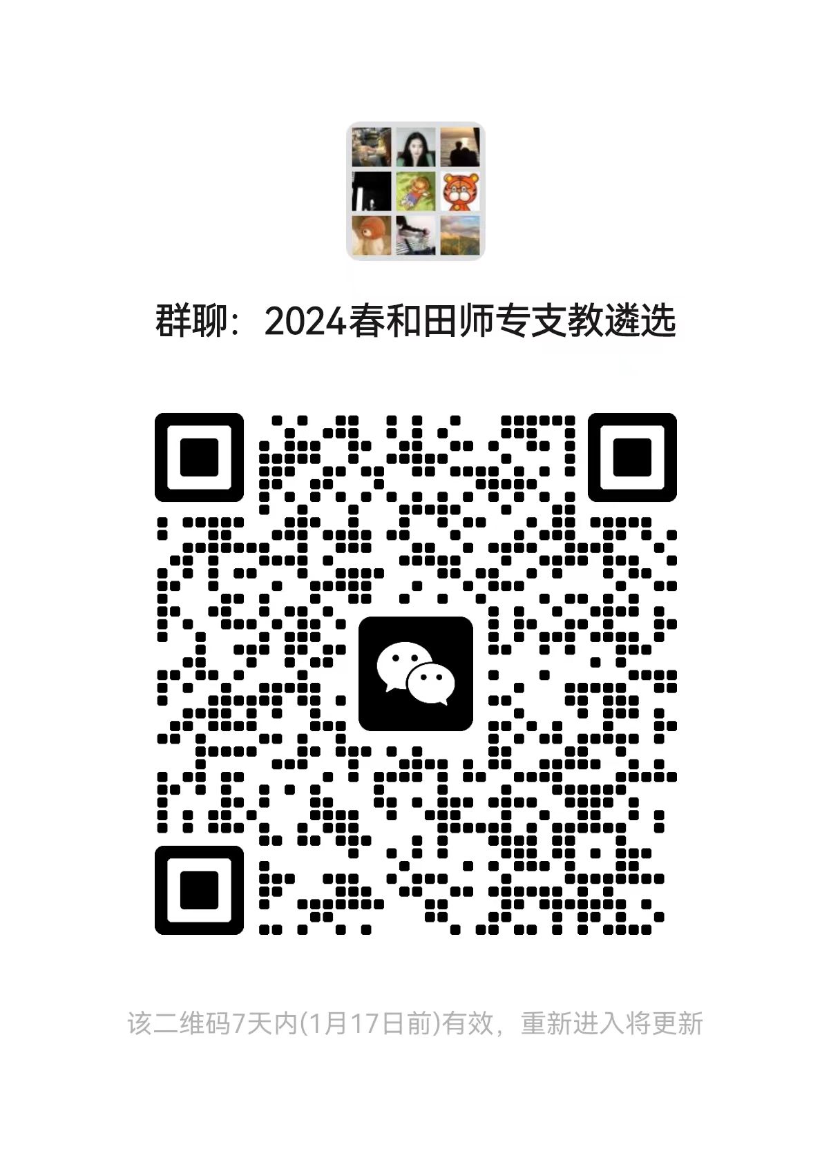 有意参加顶岗支教的研究生同学,报经导师、辅导员和所在培养单位分管领导同意后,于1月16日18:00之前发送支教报名表(需签字盖章)、导师同意截图、教师资格证扫描文件压缩包至3578180398@qq.com,并扫描下方二维码加入微信群以接收后续遴选工作通知。