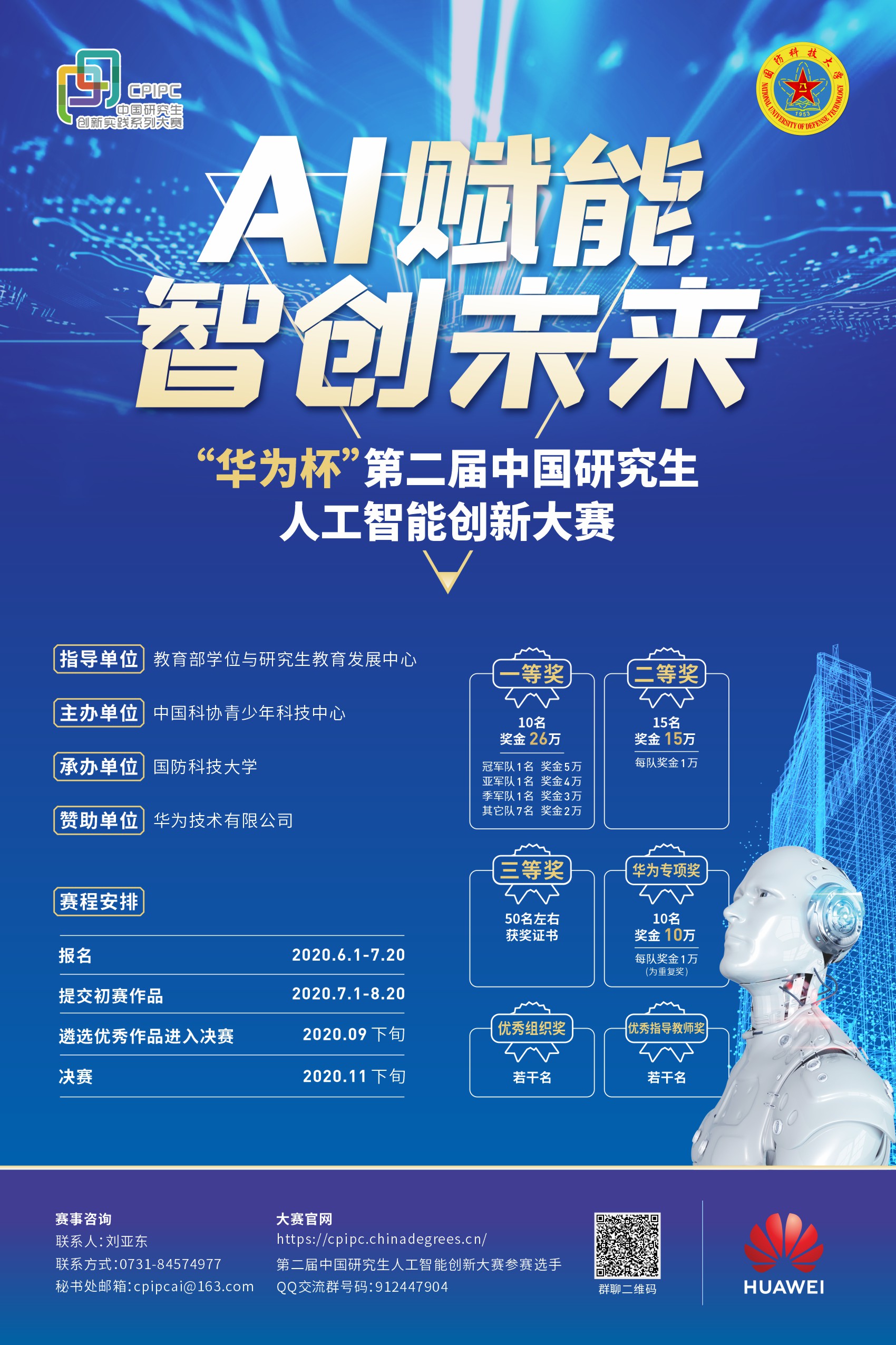 “中国研究生人工智能创新大赛”是中国研究生创新实践系列大赛主题赛事之一,由教育部学位与研究生教育发展中心指导、中国科协青少年科技中心主办。本届大赛由国防科技大学承办,华为技术有限公司赞助,大赛秘书处设于浙江大学。参赛报名时间2020年6月1日—7月20日,大赛详情参见附件。欢迎研究生积极踊跃报名,学校根据相关管理办法将对获奖研究生进行奖励。