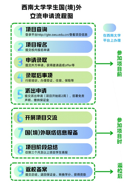 参加项目同学需根据betway西汉姆联学生国(境)外交流申请流程(请点击下载)登录学生全球化学习管理平台http://gte.swu.edu.cn/完成报名、派出及返校相关流程。