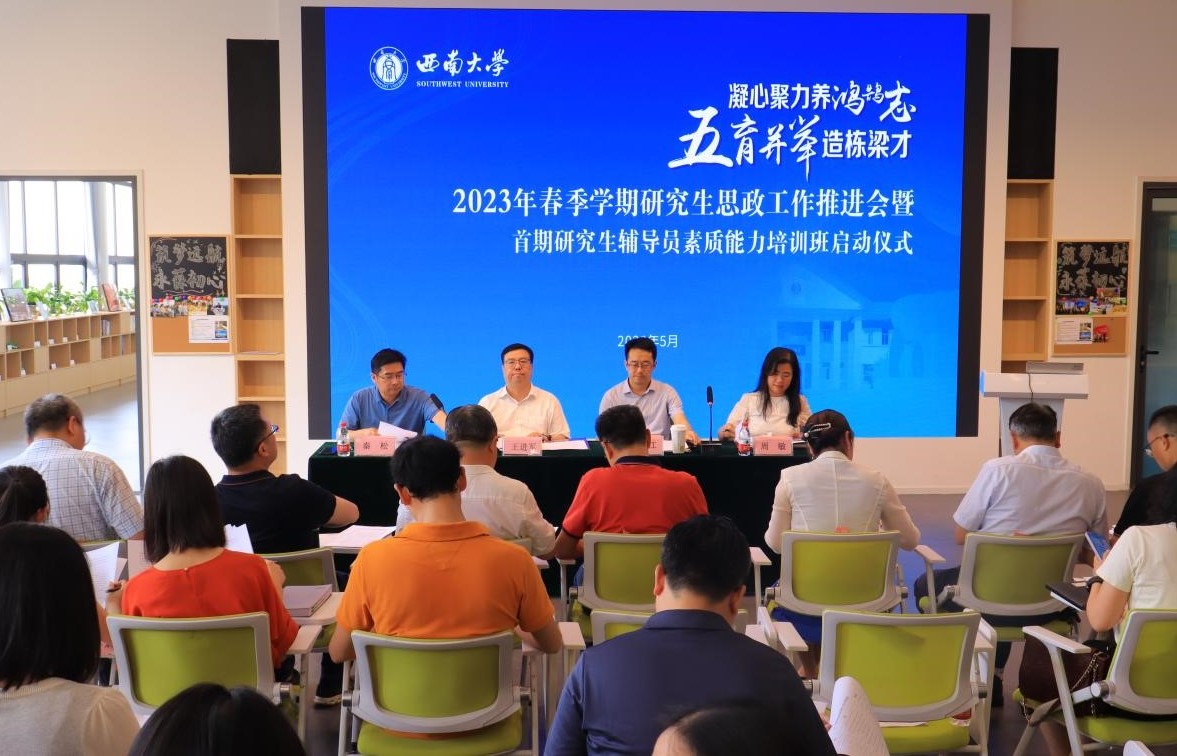 为学习贯彻习近平总书记在中共中央政治局第五次集体学习时关于加快建设教育强国的重要讲话精神,进一步推进研究生思政工作,提升研究生辅导员素质能力,5月30日,学校在“青李空间”会议室召开“凝心聚力养鸿鹄志,五育并举造栋梁材”为主题的春季学期研究生思政工作推进会暨首期研究生辅导员素质能力培训“研行”班启动仪式。学校副校长王进军出席会议。各二级培养单位、研究生院 党委研究生工作部相关负责同志参加会议。