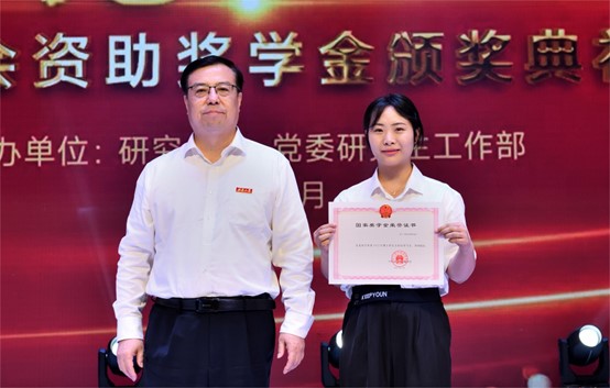 王进军为博士生国家奖学金获得者逐一颁发获奖证书。黄杰及研究生奖助评审工作领导小组成员单位负责人为硕士生国家奖学金获得者代表颁奖。相关单位负责人为社会资助奖学金获得者颁奖。