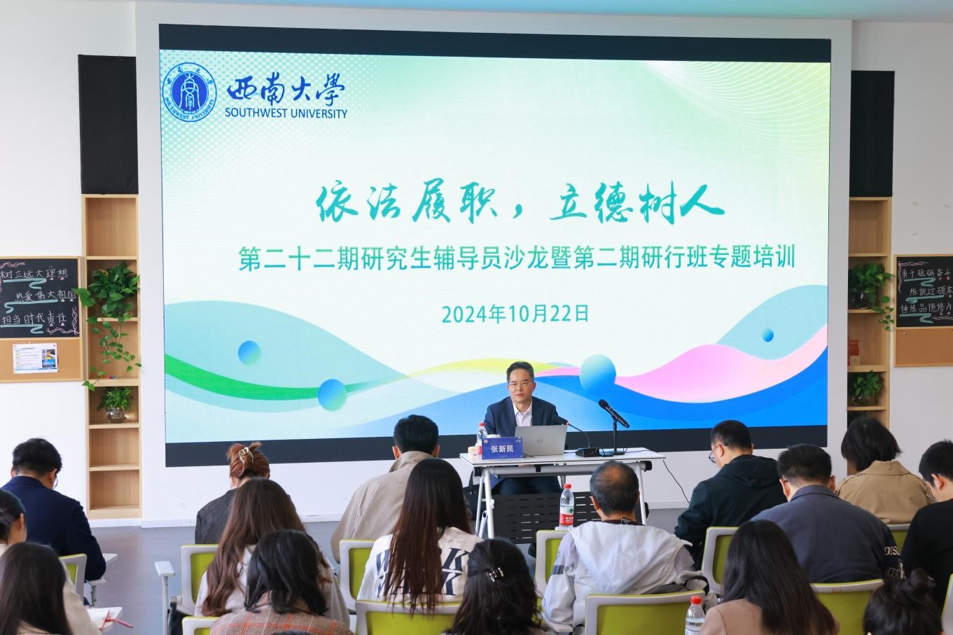 为深入学习贯彻习近平法治思想和习近平总书记在全国教育大会的重要讲话精神,不断提升学校研究生教育治理体系和治理能力现代化水平,22日上午,第二十二期研究生辅导员沙龙暨第二期“研行班”专题培训于青李空间A11多功能厅召开。本次培训会邀请法学院张新民教授作专题报告,各二级培养单位分管研究生思政工作负责人、专兼职研究生辅导员和第二期“研行班”学员参加培训。会议由党委研究生工作部部长秦松主持。