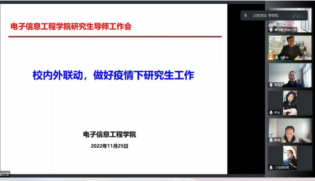 2022年11月25日下午,电子信息工程学院开展研究生导师在线培训会议,李传东院长首先通报了当前学校的疫情防控情况,并通报了秋季学期毕业答辩及2023年研究生报考情况,在疫情期间异常严峻的就业形势下,2020 级毕业生毕业去向落实率目前已达98.9%,这来之不易的成绩是师生共同努力的成果,大大鼓舞了师生们的士气,坚定了战胜疫情的决心。