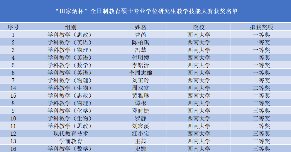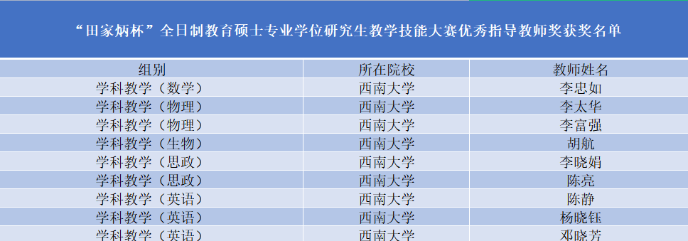 为进一步加强教育硕士专业学位研究生教学实践能力的培养,促进培养院校之间的相互交流学习、共同发展,全国“田家炳杯”全日制教育硕士专业学位研究生教学技能大赛决赛于2021年12月22日至24日举办。经过激烈的竞争,我校研究生在比赛中发挥出色,获得一等奖6名,二等奖3名,三等奖7名,9名指导教师获得优秀指导教师奖获。
