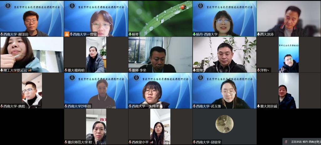 为贯彻《中国教育现代化2035》文件精神,发挥课程学习在研究生培养中的作用,杨丹教授主持的重庆市教育委员会研究生教育教学改革研究重大项目“重庆市研究生优质课程建设实施成效分析及优化路径研究”(立项编号:yjg211023)自2021年6月立项以来,充分收集相关资料,研究重庆市研究生优质课程建设规律,对各高校市级研究生优质课程的管理制度、运行情况和建设成效等展开调查,以期对十四五期间重庆市研究生优质课程建设提供实施方案。本次会议的主要目的是交流重庆市研究生优质课程建设成效,研讨调查问卷和研究内容等。