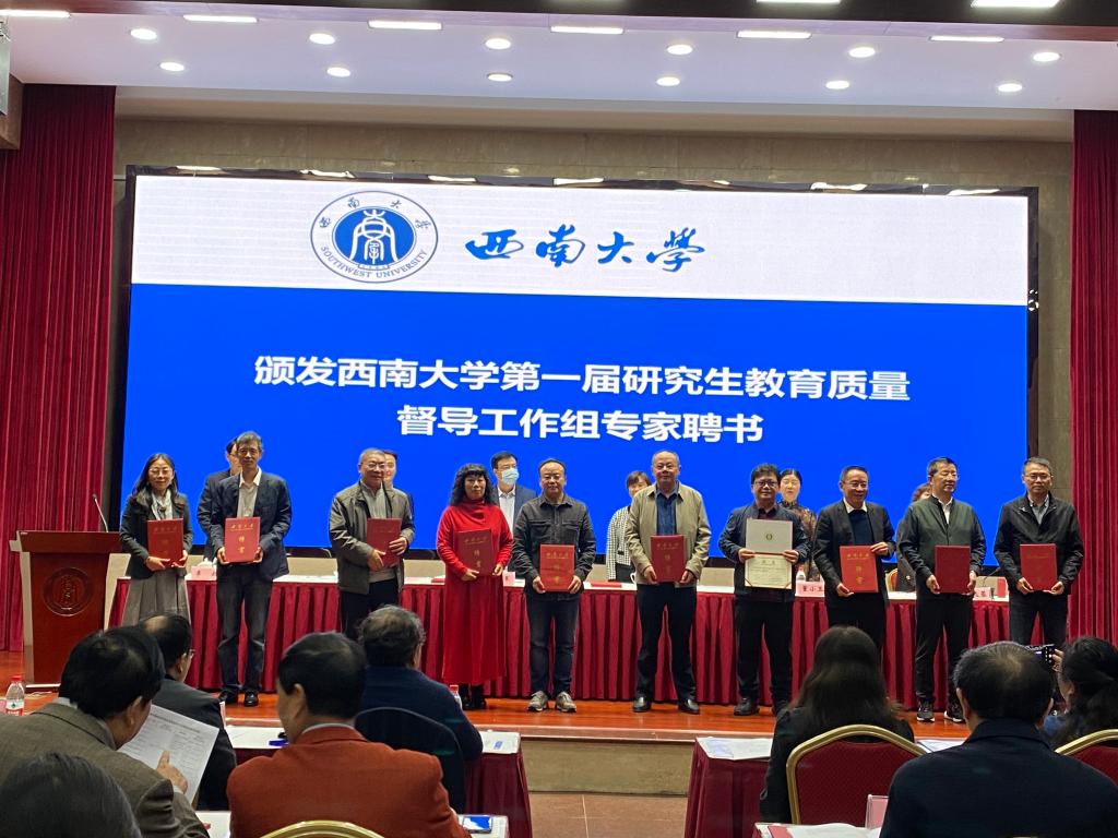 会议现场,王进军、石孝均、董小玉、李云及李远蓉向betway西汉姆联第一届研究生教育质量督导工作组专家颁发聘书。