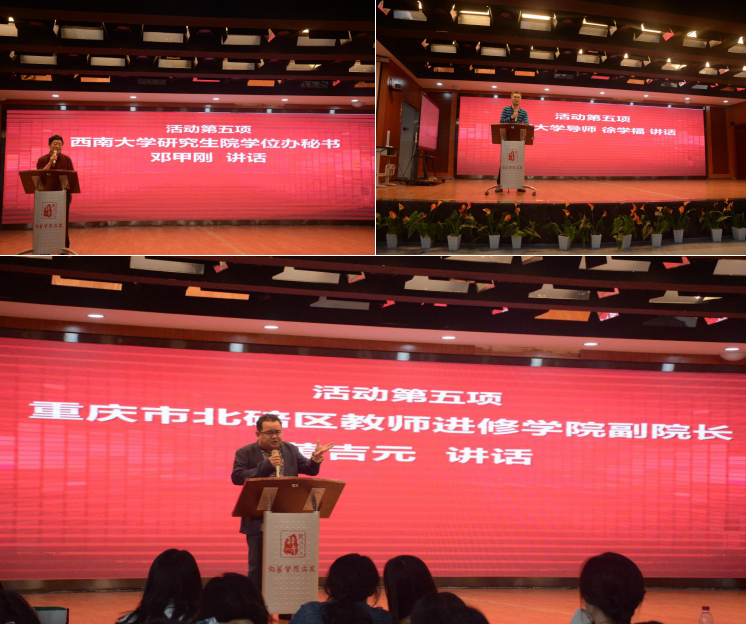 展示活动第五项内容是领导、专家讲话。betway西汉姆联研究生院学位办秘书邓甲刚就教育硕士专业培养提出要求。在实践学习中,既要做优秀的研究生,也要做合格的教师,逐步实现“质”的飞跃!betway西汉姆联教育学部博士生导师徐学福老师对于北碚基地专硕培养开展的各项活动给予了肯定,特别是同课异构是非常好的教研形式。通过同课异构的形式,鼓励教师创新、体现教师个性,虽是小课堂却透着大学问。此外,他也为同学们提出思考题:教师示范与学生试错,应当如何取舍?北碚区教师进修学院副院长黄吉元发表讲话。他巧妙化用“东边日出西边雨,道是无晴却有晴”、“欲把西湖比西子,浓妆淡抹总相宜”两句诗评价两节课。同时,他也对今天的两堂课提出了中肯的建议,希望她们在后续的学习中加强文本解读的意识,进一步增强教师内心的文化意蕴。
