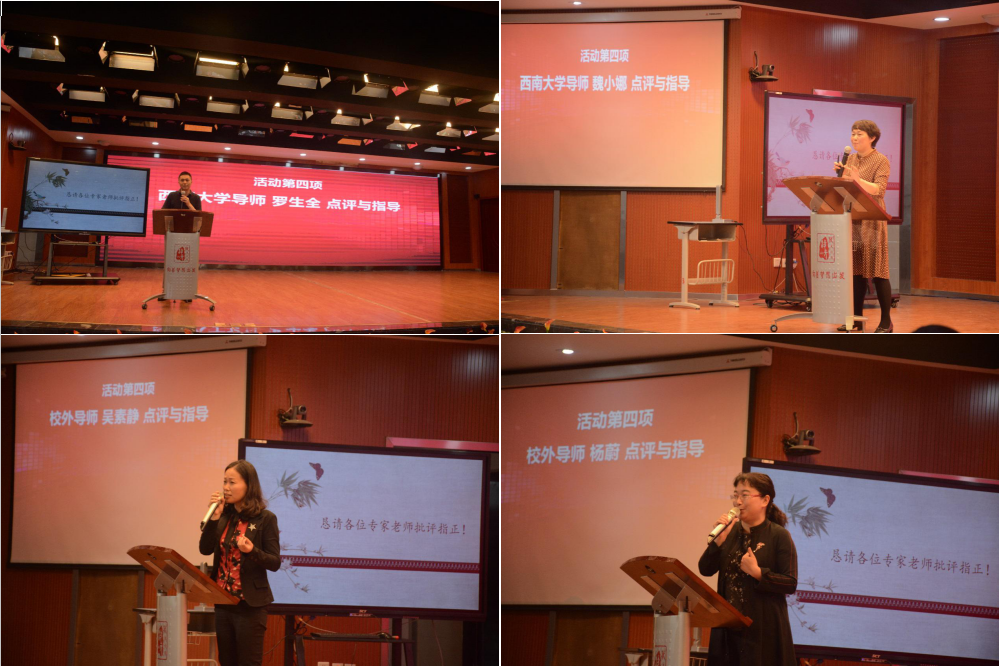 展示活动第三项内容是授课老师的说课和反思。两位同学分别从教学目标、教学方法和教学理念、教学过程、教学反思等机关方面进行了课后说课。两位同学都提到,授课过程中对文本的解读还是不够深刻,教学方法运用得还是不够熟练,希望各位专家和老师能给予更多的指导和建议。