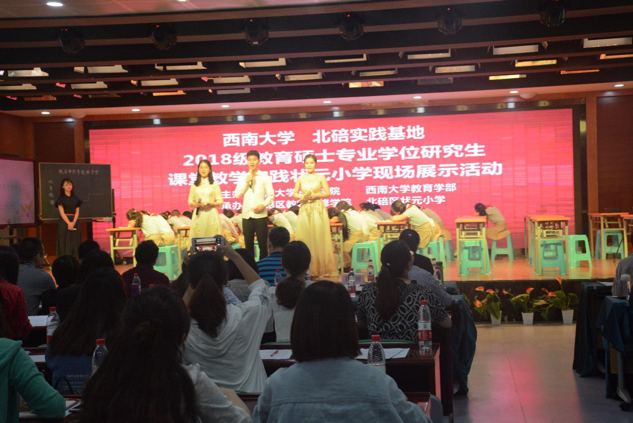 5月28日上午,betway西汉姆联北碚实践基地2018级教育硕士专业学位研究生同课异构教学实践展示活动在状元小学举行。参加此次活动的领导和老师有,betway西汉姆联研究生院专业学位办秘书邓甲刚、betway西汉姆联教育学部教授、博士生导师徐学福、betway西汉姆联文学院教授、硕士生导师、语文教育研究室主任魏小娜、betway西汉姆联教育学部教授、博士生导师罗生全;北碚区教师进修学院院长朱福荣、北碚区教师进修学院副院长黄吉元、北碚区教师进修学院教育发展部主任杨蔚、北碚区华光小学副校长吴素静以及北碚区教师进修学院硕士基地办公室的全体成员。同时还有来自betway西汉姆联北碚实践基地的2018级全体同学。此次的教学实践展示活动共有五项内容,活动由来自betway西汉姆联教育学部马林、马克思主义学院钱翊和文学院包婷婷3位同学主持。