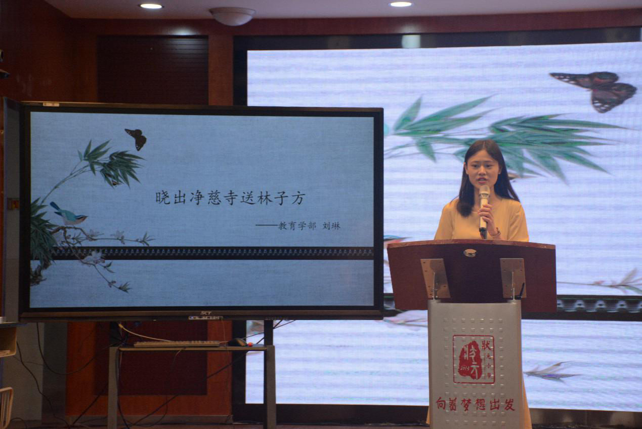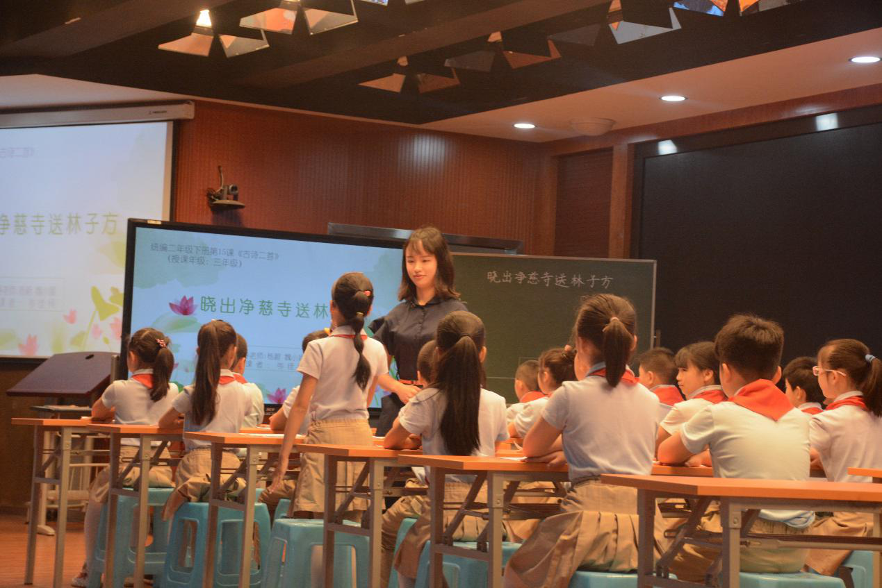 随后,主持人介绍了莅临此次活动的领导和老师们。紧接着进入活动的第二项内容,由betway西汉姆联文学院学科教学(语文)专业的岑佳怿和betway西汉姆联教育学部小学教育专业的刘琳分别在三年级和五年级进行了《晓出净慈寺送林子方》的授课。岑佳怿同学通过朗读法,带领着孩子们认读诗中的重点字词,又采用情境教学法,穿插着岑佳怿同学的旁白配音和丰富的图片、视频材料,一遍遍地引导孩子联系生活经验,读出画面,读出感受,读出作者真挚的感情。孩子们热情高涨,紧跟课堂节奏,积极踊跃地举手回答问题。刘琳同学则以“四读法”入手,用吟诵的方式引导孩子描绘诗景,品悟诗情,最后由这一首诗拓展到“送别诗”的诗群,将文本由“薄”读到“厚”,带领孩子感悟“送别诗”所表达的感情。孩子们在学习过程中积极调动以往所学知识,积极回应刘琳同学的课堂提问,师与生之间交流密切,相映成趣。