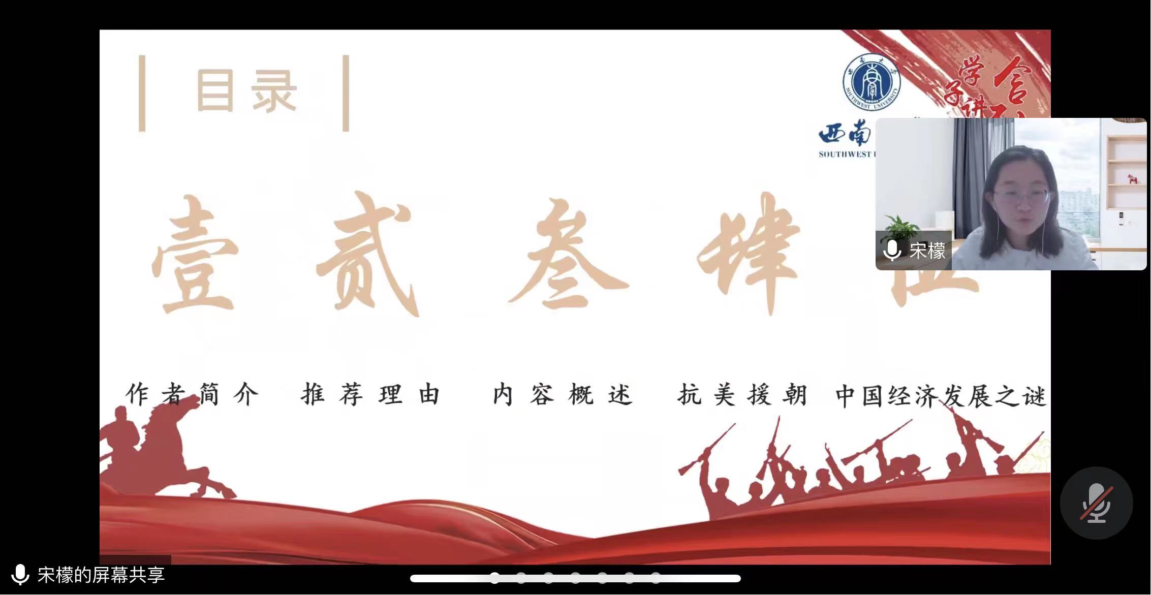 2022年11月25日下午,含弘学子系列讲堂(一)之经济管理学院“研读•经管”第十三期读书会在线上举行。本次读书会以“触摸历史脉搏,感悟红色经典”为主题,由经济管理学院2022级农业管理专业硕士研究生陈鸣同学、2021级金融专业硕士研究生宋檬同学、2021级国民经济学专业硕士研究生张梦洁同学以及2022级会计专业硕士研究生唐阳平同学担任主讲人,经济管理学院第十七届研究生团总支 研究生会全体成员参加。本次读书会由2022级金融专业硕士研究生严雨珂主持。