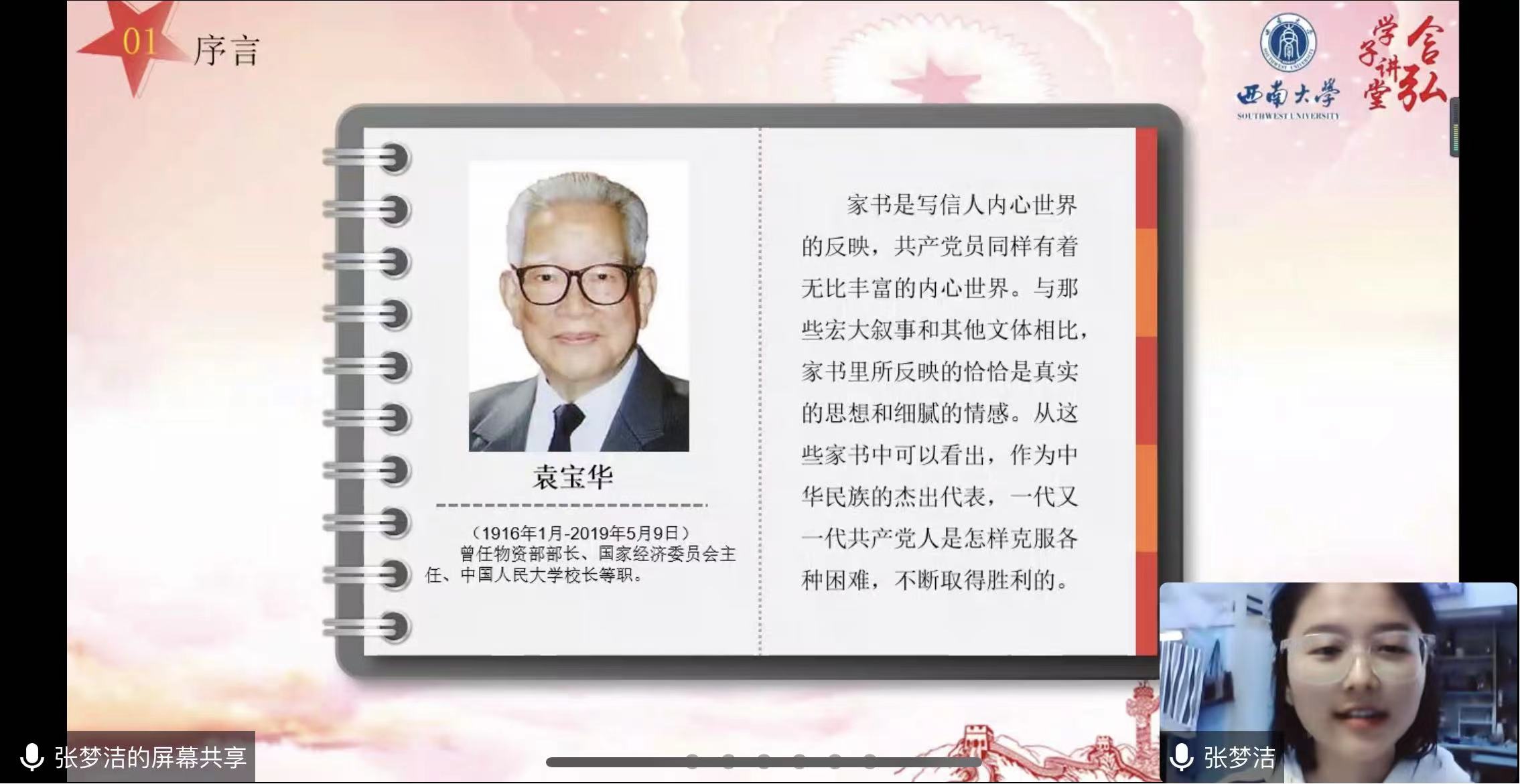 张梦洁同学分享了《红色家书背后的故事》,这本由五十多个作者的近百封家书及其背后的故事组成,家书的作者都是中共党员和追求进步的人士,他们为实现自己的政治理想,付出了鲜血和汗水。她选择了其中的两个故事为大家进行详细讲述:一是吉鸿昌先生的绝笔家书,真实刻画出他牺牲的英勇形象;二是牟宜之先生的亲笔家书,先生大道如天任我行的精神,鼓励着同学们牢记初心使命,勇担肩上重任。