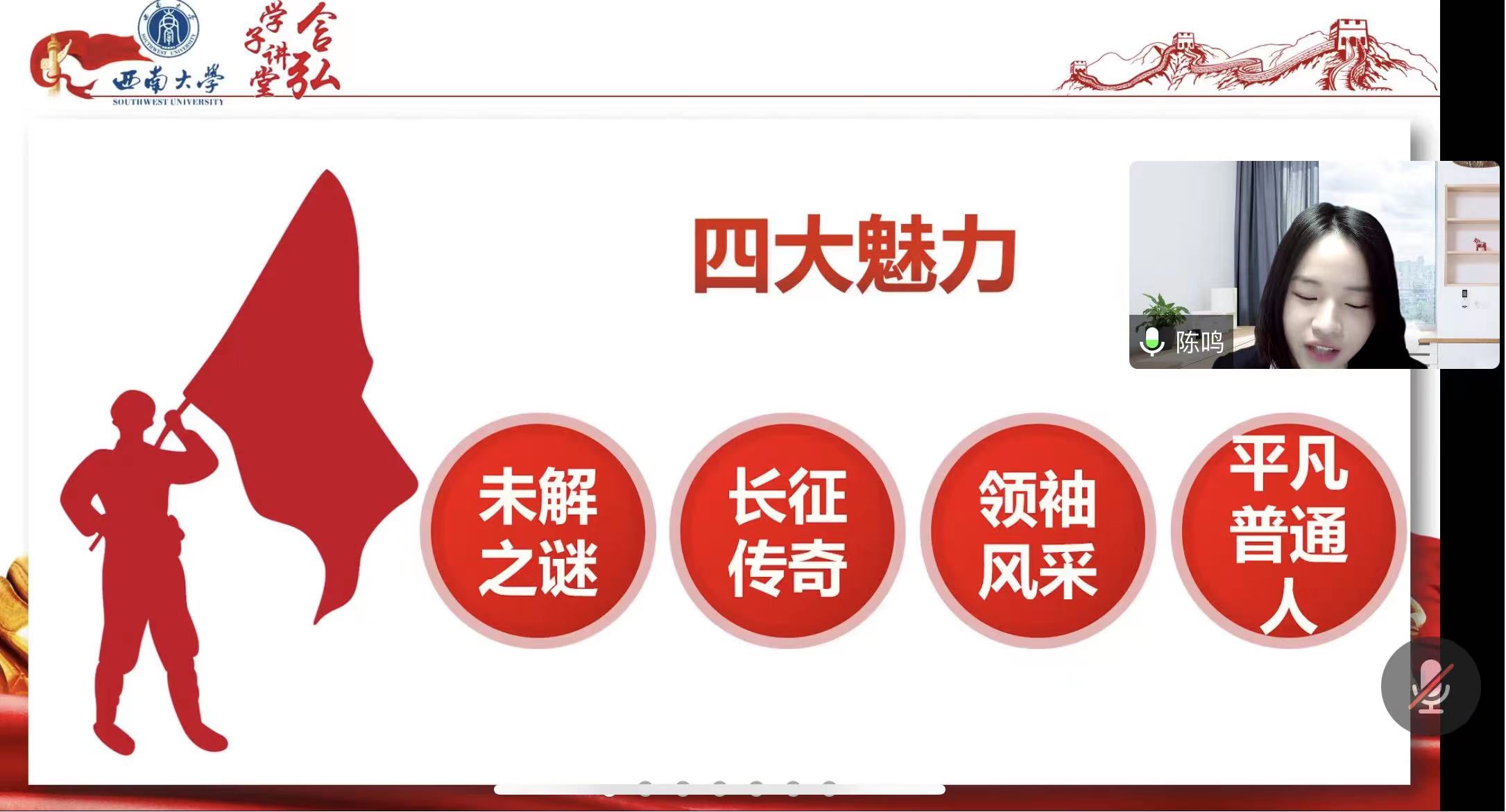 陈鸣同学分享了《红星照耀中国》一书。她首先介绍了中央工农红军的长征路线,并用真实的数据为同学们生动还原了红军长征途中艰难的情景。随后,她分享了书中作者斯诺在火车上与青年人攀谈的精彩片段,并详细讲解了该书的魅力,从多个角度带领同学们体验漫漫长征之路,感悟长征精神,给同学们带来了极大的鼓舞和激励。
