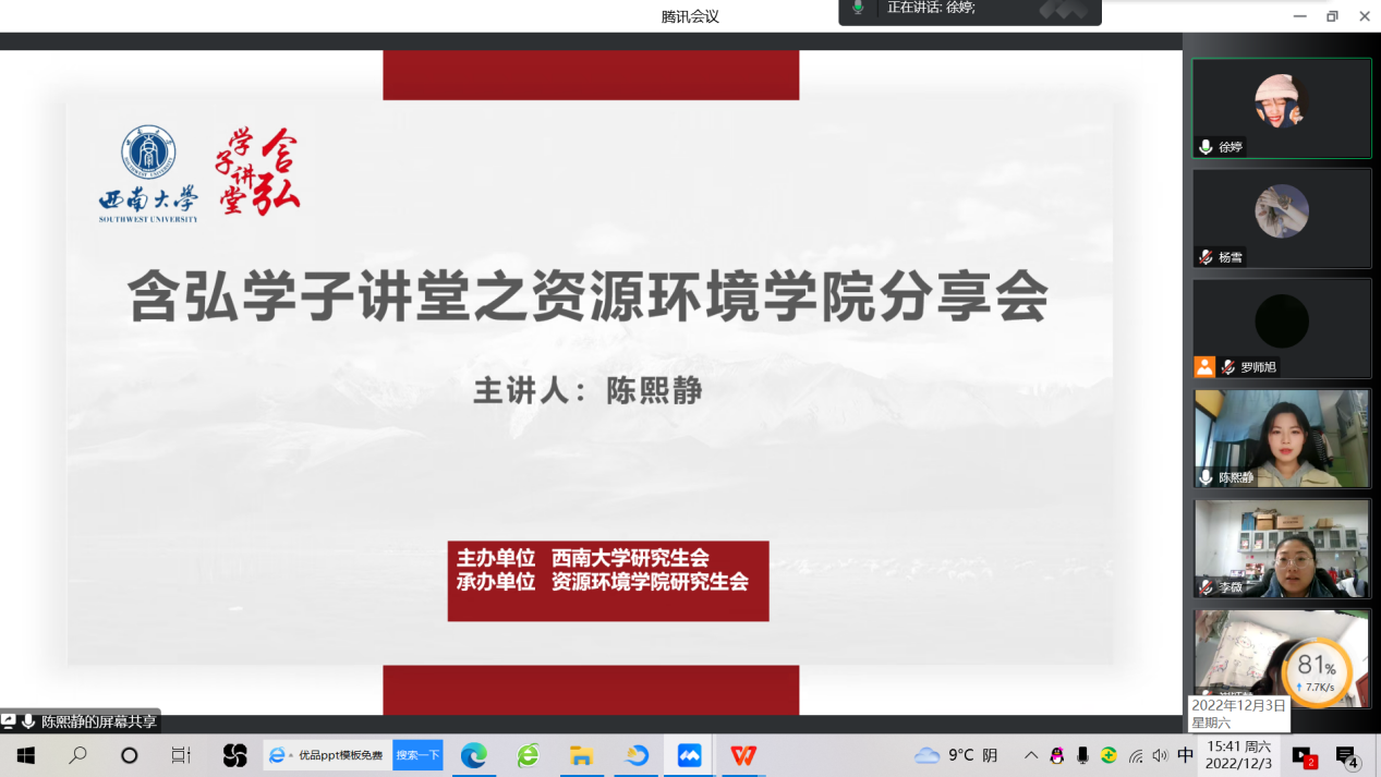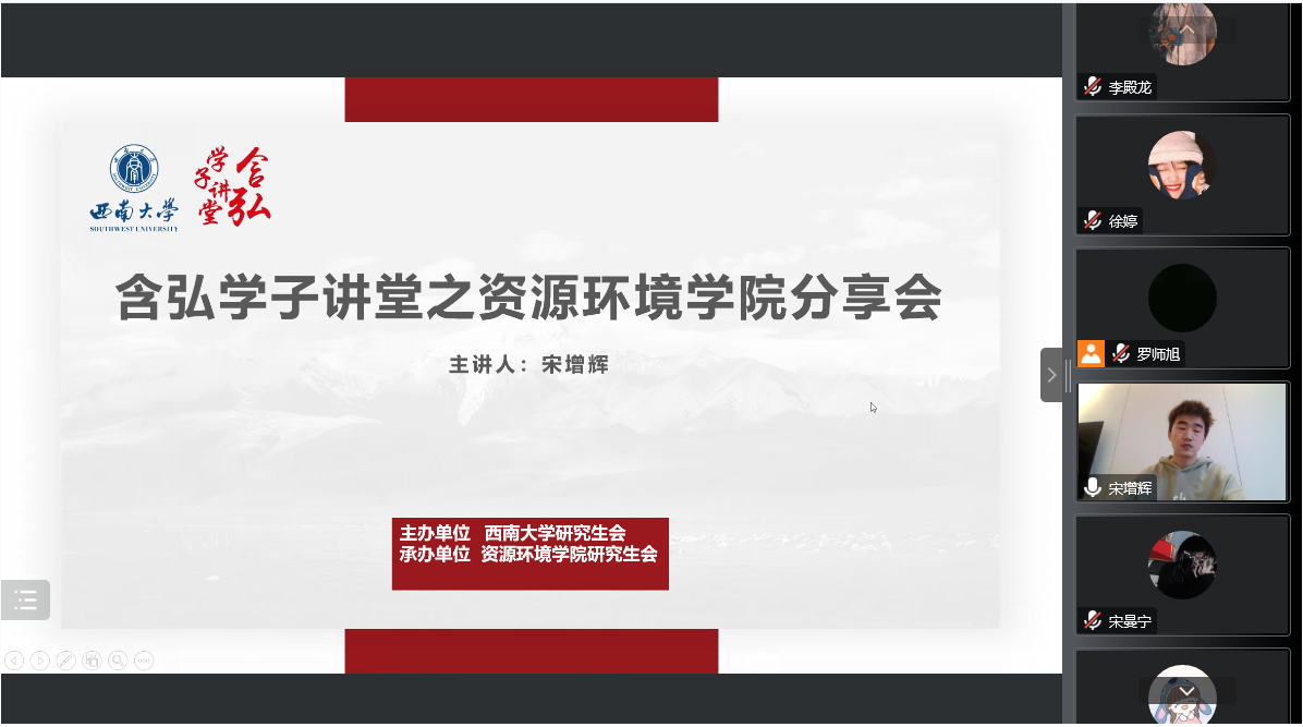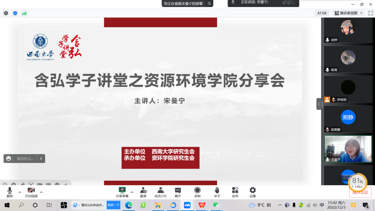 2022年12月3日下午3点,含弘学子讲堂之资源环境学院“学习二十大,奋进新征程”主题活动在线上举行。本次活动由来自资源环境学院2022级农业资源与环境专业研究生宋曼宁和王姿予、2022级资源利用与植物保护专业研究生陈熙静和宋增辉担任主讲人,学院研究生会成员及其他学生代表参加了此次活动。