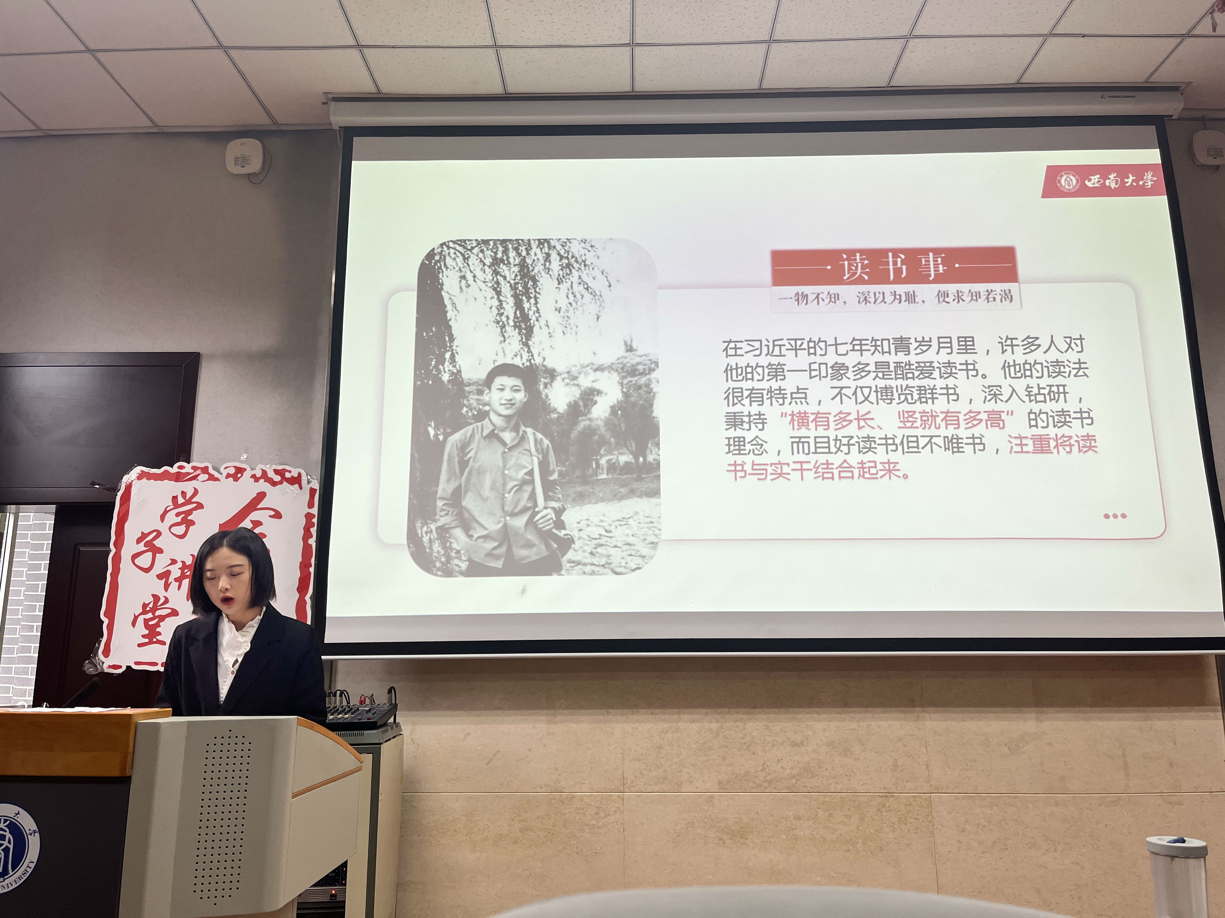 在首届全民阅读大会开幕式上,习近平总书记发来贺信:“希望广大党员、干部带头读书学习,修身养志,增长才干;希望孩子们养成阅读习惯,快乐阅读,健康成长;希望全社会都参与到阅读中来,形成爱读书、读好书、善读书的浓厚氛围。”周婉婷同学以习近平总书记的读书之道为题分享了我国2021年的全国国民阅读现状,她希望大家能够以读书对抗焦虑,养成“爱读书、读好书、善读书”的阅读习惯。