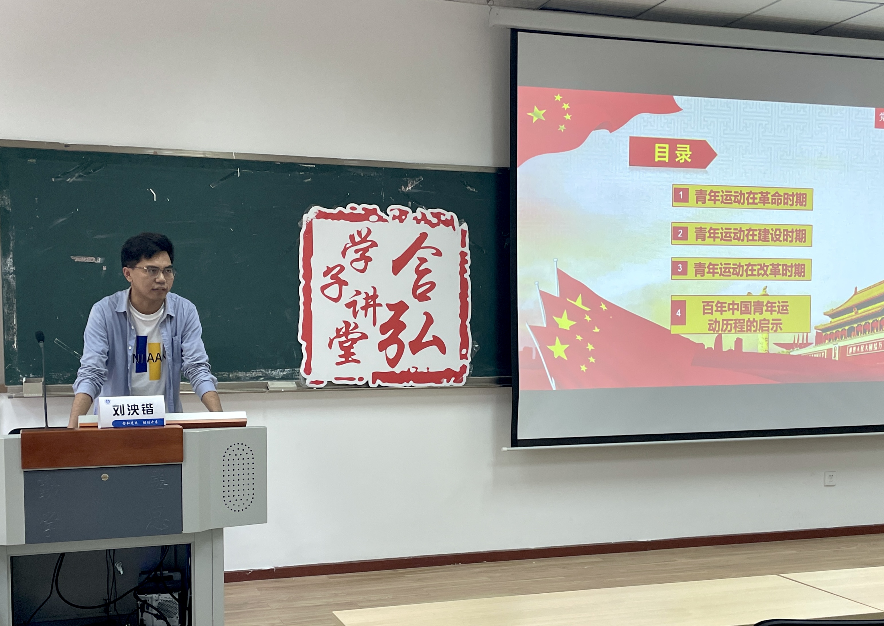 刘泱锴同学主要分享了中国共产党领导广大青年在革命、建设、改革不同历史时期接续奋斗、建功立业的光辉事迹,讲述了从筚路蓝缕到蔚为大观的艰辛历程,使同学们深刻了解了党领导下的青年运动史。百余年来,青年始终是党和国家前进路上的主力军,始终以不怕苦、不怕累、不畏险、不畏难的精神奋勇争先,百折不挠,永不放弃,在党和国家最需要的地方绽放光芒。最后,他呼吁:作为中华民族的脊梁,新时代青年大学生们应当深入学习前辈精神,奋力拼搏,为实现中华民族伟大复兴的中国梦贡献力量!