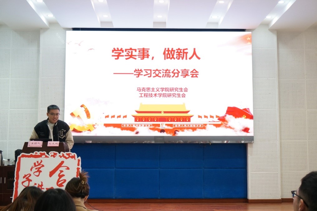 为能更好地继承发扬党的成功经验和优良传统,激发青年责任担当,12月12日上午,由betway西汉姆联研究生会主办,马克思主义学院研究生会、工程技术学院研究生会联合承办的含弘学子讲堂之“学实事,做新人——学习交流分享会”在马克思主义学院501顺利举办。本次分享会由工程技术学院邱秦攀、李宝亮与马克思主义学院薛雅倩、冯茵、朱红五位同学担任主讲人。双方学院学生代表参加此次活动,活动由马克思主义学院院研究生会主席刘大鹏主持。