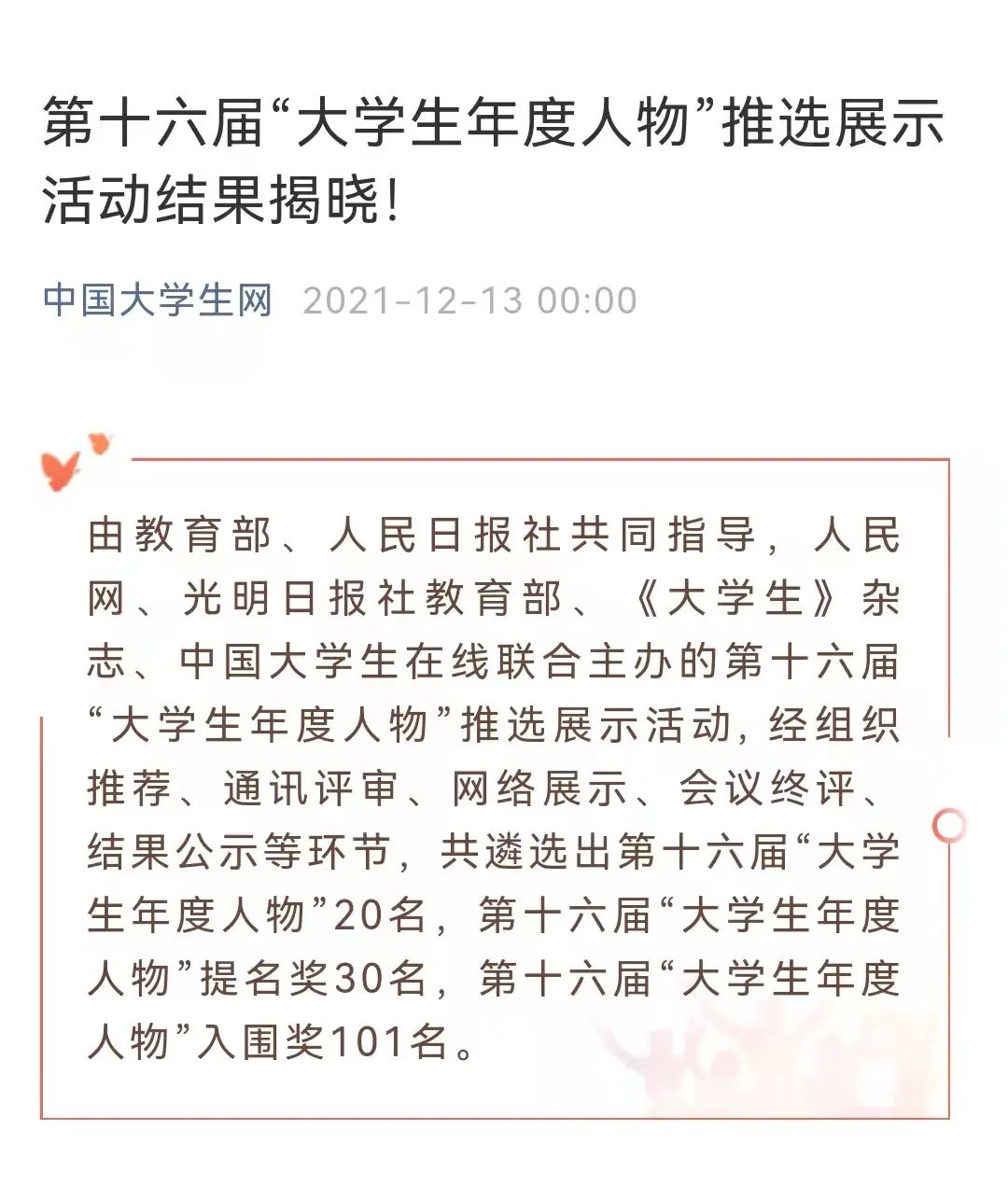 近日,由教育部、人民日报社共同指导,人民网、光明日报社教部、《大学生》杂志、中国大学生在线联合主办的第十六届“大学生年度人物”推选展示活动, 经组织推荐、通讯评审、网络展示、会议终评、结果公示等环节,共遴选出第十六届“大学生年度人物”20名,第十六届“大学生年度人物”提名奖30名,第十六届“大学生年度人物”入围奖101名。学校课程与教学论专业2017级博士研究生施廷懋入选第十六届“大学生年度人物”。