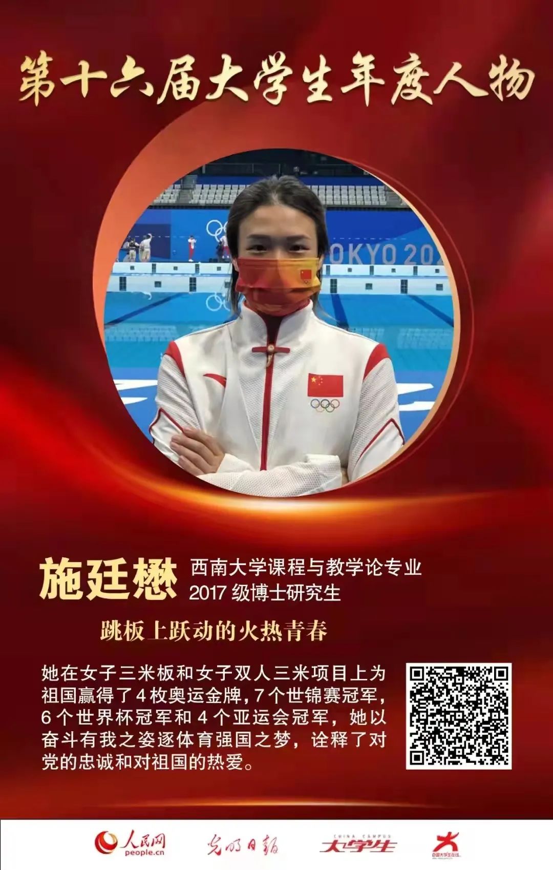 施廷懋,女,中共党员,1991年出生于重庆市渝中区,2010年考入学校运动训练专业,本科毕业后,继续在学校攻读硕士和博士研究生,现为课程与教学论专业2017级全日制博士研究生。施廷懋作为中国女子跳水队运动员,截止目前在女子三米板和女子双人三米项目上赢得4枚奥运金牌,7个世锦赛冠军,6个世界杯冠军和4个亚运会冠军。