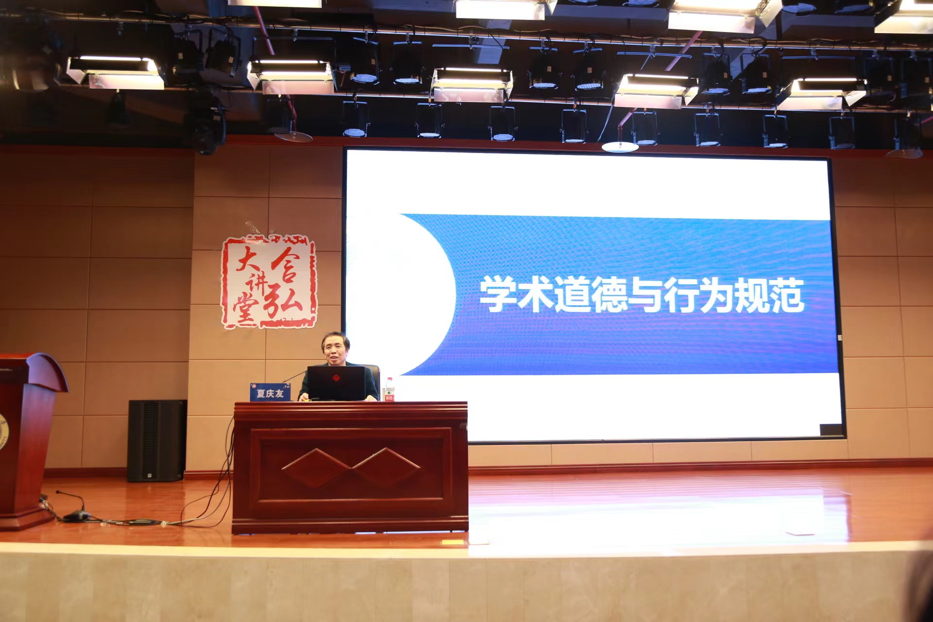 夏庆友教授以“怎样看待近日多发的学术不端事件”引出讲座主题——学术行为规范及学风建设。他指出,优良学风是大学精神的集中体现,是高等学校的立校之本,风清气正的学术生态是科学发展和教育事业兴旺的基石,学术不端行为将助长急功近利的学术风气,也将对社会发展产生不利影响。