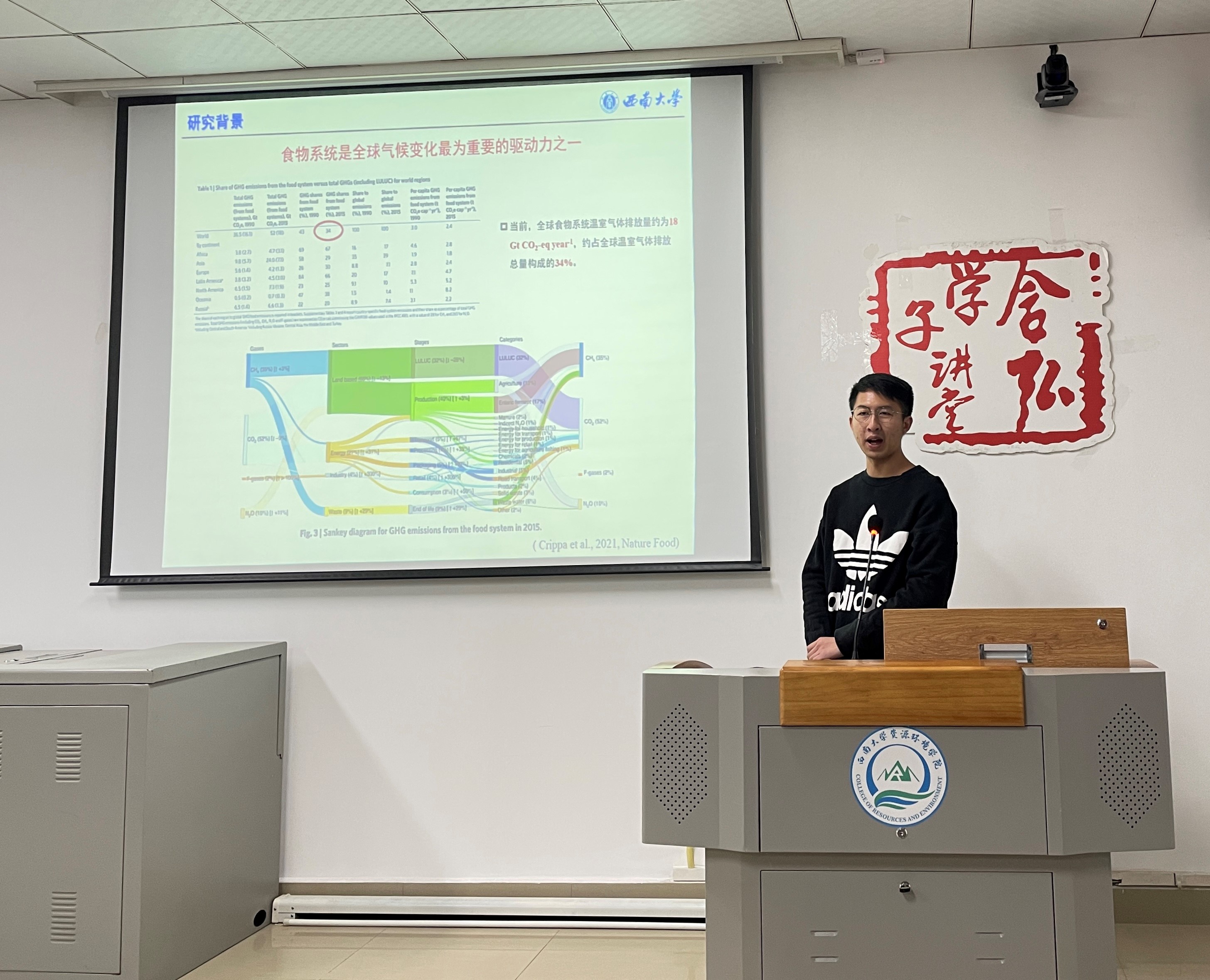 冯适分享了他对食物系统的温室气体排放及其减排策略的研究进展。从食物全生命周期温室气体排放途径及其评价方法、不同来源的单个食物的温室气体排放、不同国家膳食消费结构的温室气体排放、食物系统温室气体减排策略四个方面为大家进行了详细的阐述,跨学科讲述了在未来研究中亟需从准确评价各国居民膳食消费量、完善碳足迹核算系统边界、使用区域本地化碳足迹参数三个方面提高评价结果的准确性,即实现食物系统低碳可持续转型的理论依据。