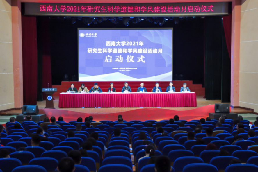 10月20日下午,学校2021年研究生科学道德和学风建设活动月启动仪式在光大礼堂顺利举行。学校党委副书记潘洵出席,各相关职能部门负责人、各研究生培养单位相关负责人、导师代表、研究生辅导员、研究生代表参加启动仪式。