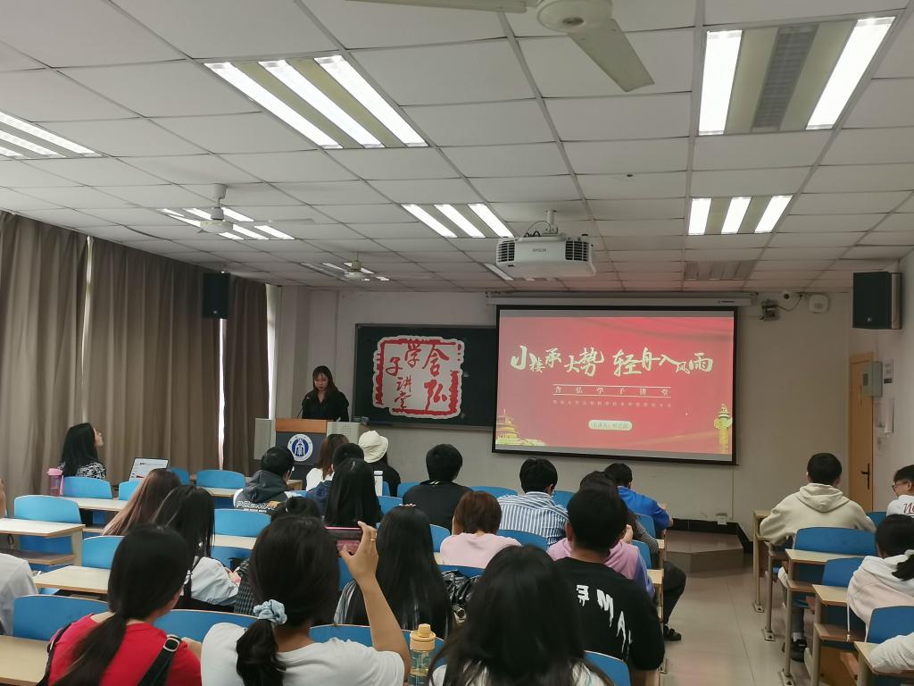 韦艳群分享了遵义会议、四渡赤水战役、娄山关大捷和苟坝会议等党史上的重要事件,从事件的背景、过程和意义入手,并通过播放遵义会议和娄山关战役的实景演出视频,使同学们更加深刻的了解当时的情况。提出当代的青年应当传承弘扬遵义精神,走好新时代长征路,不辜负这个伟大时代赋予我们新时代青年的历史使命和责任担当。