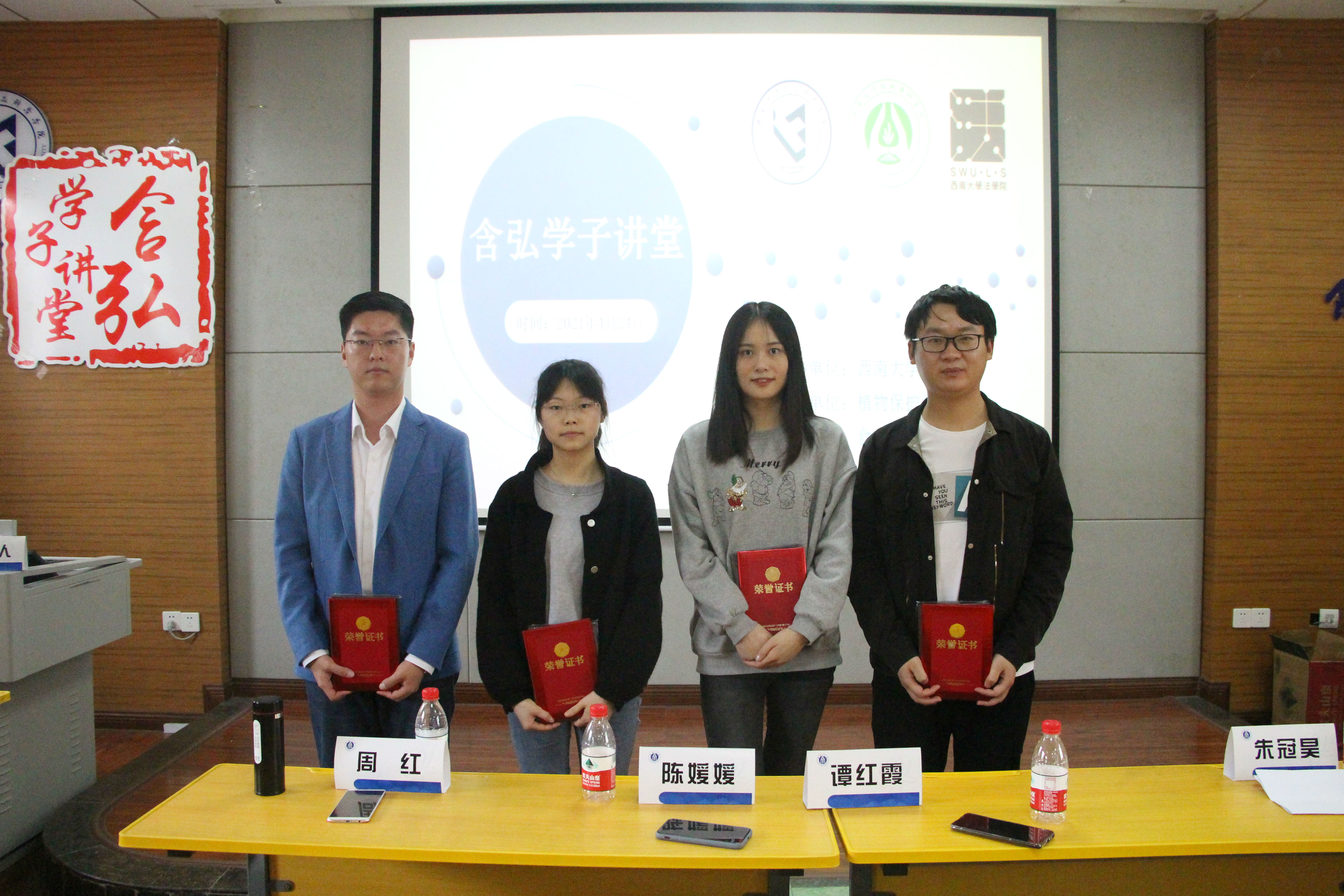 本次含弘学子讲堂,植物保护学院2019级农药毒理学专业博士研究生周红、食品科学学院2019级食品科学与工程专业博士研究生谭红霞、食品科学学院2019级食品科学专业博士研究生陈媛媛、法学院2020级经济法学专业硕士研究生朱冠昊作为主讲人带来了不同学科的知识科普。