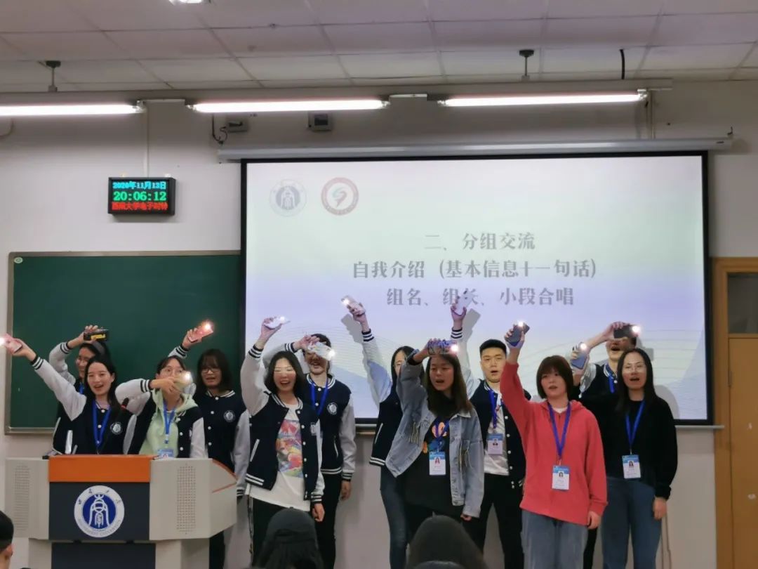 随后,全体学员被分为七小组,按照分组情况选举各组组长,并完成组名拟定、口号编写以及组歌排练。经过40分钟的激烈讨论,7个小组分别上台展示各自的小组文化,大家风格迥然不同,有的积极活泼、有的风趣幽默、有的严谨求实,来自第五小组的张志彬同学更是以一首美声版《难忘今宵》将整个破冰仪式推向了高潮。
