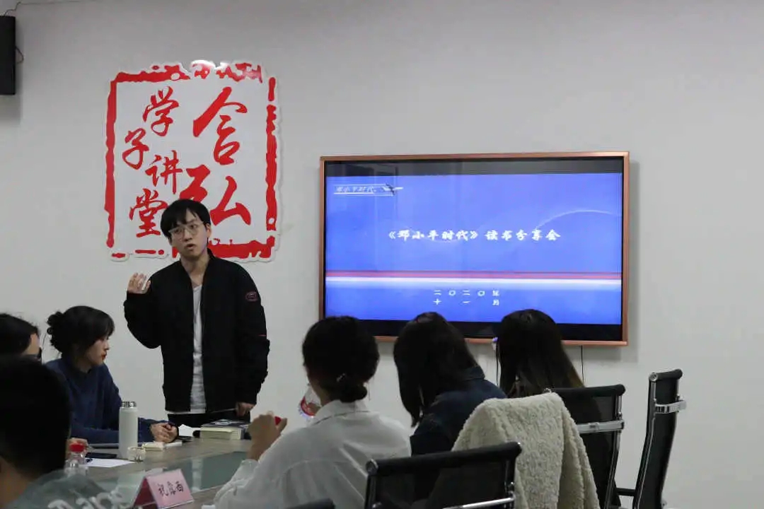 郇宜达同学分享了《邓小平时代》。《邓小平时代》是由美国哈佛大学傅高义教授倾10年心力完成的权威著作。傅高义教授通过大量采访的形式,以真实、客观的角度介绍邓小平的个人经历、邓小平时代在中国乃至在世界上的历史地位,旨在给西方以及想要了解中国的人展示一个真实的邓小平。郇宜达同学从“拨乱反正,解放思想”“经济改革,对外开放”“破冰台湾,解决港澳”“变革外交,中美蜜月”和“接班终定,南巡落幕”五个方面呈现该书的主要内容,最后还就分享此书的目的和大家进行了交流。