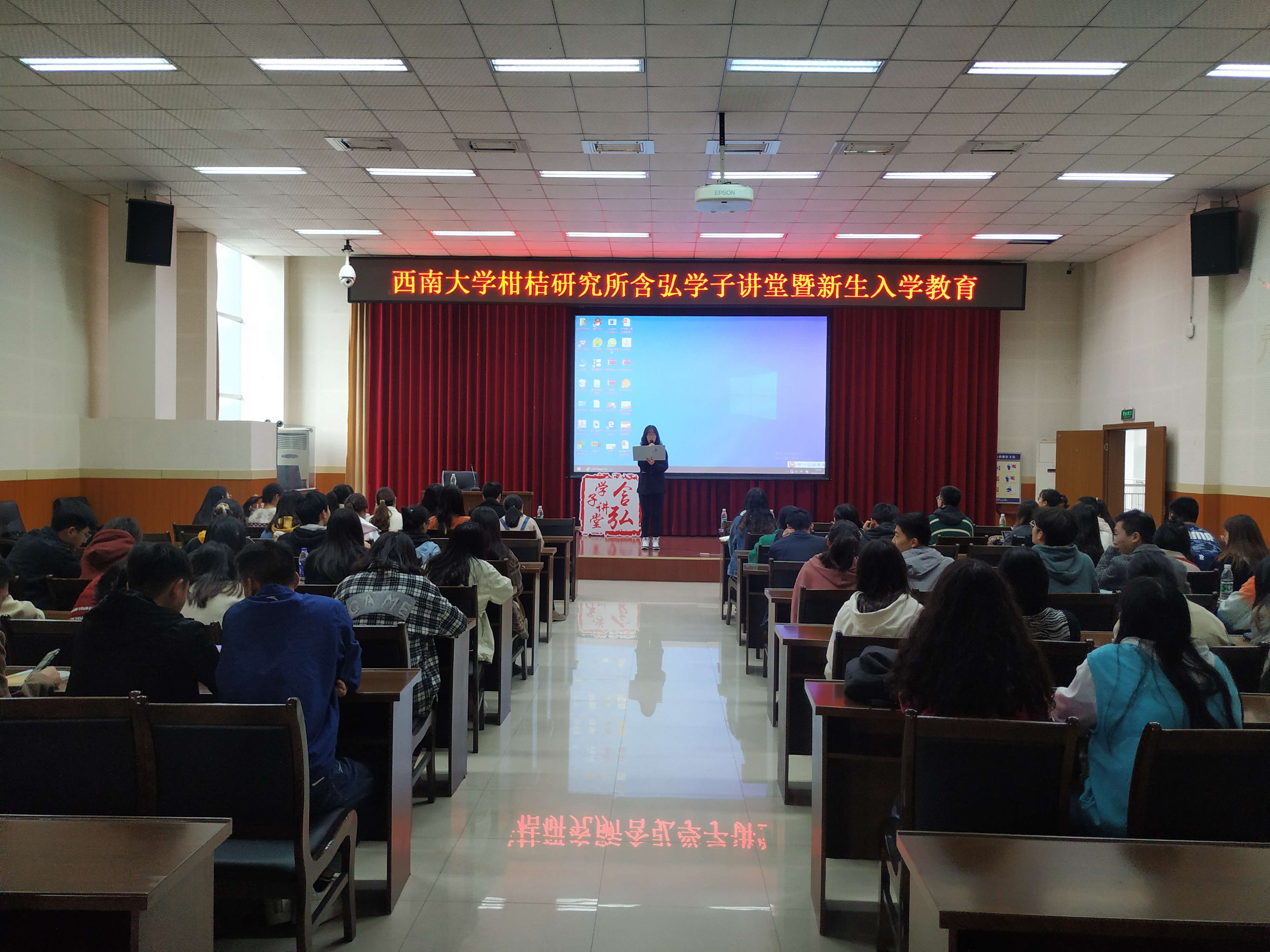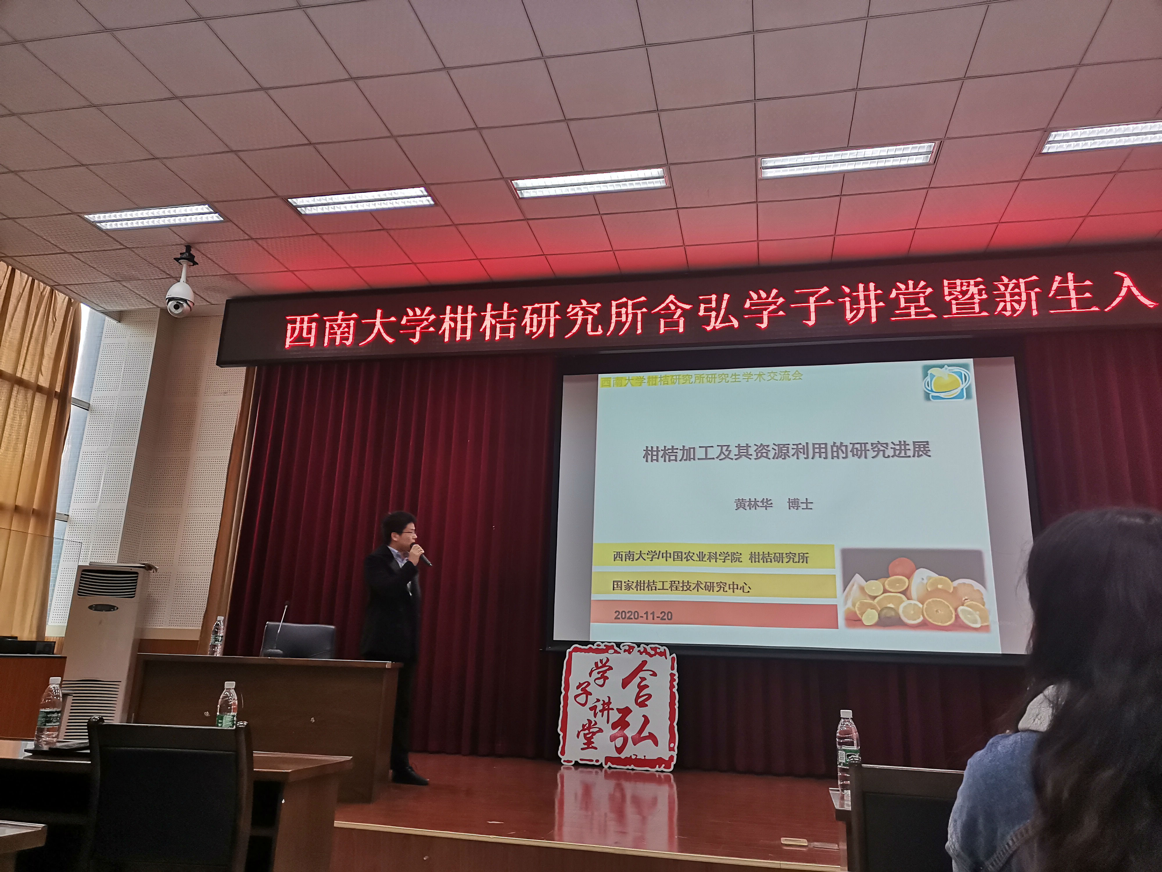 黄林华老师以“柑桔加工及资源利用的研究进展”为题,主要从柑桔加工的现状、柑桔加工农副产品的综合利用以及加工课题组研究进展等几个方面进行分享,让同学们在欢乐的氛围中以饱满的热情和坚定的信心去迎接新的挑战。