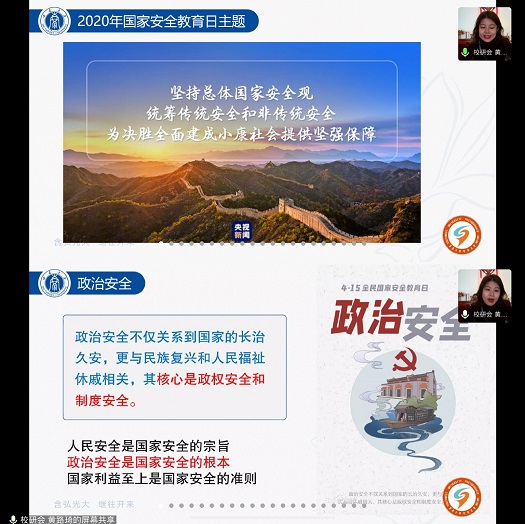 首先,校研会副主席黄路琦同学进行关于国家政治安全的讲解分享。她从总体国家安全观切入,对国家政治安全的核心要义、维护国家政治安全的重大意义等方面进行详细讲解,让大家进一步理解了政治安全是国家安全的根本。她表示在当前中国面临着国内外双重压力之际,作为研究生干部的我们更应增强国家安全知识储备,肩挑重担,为国分忧。