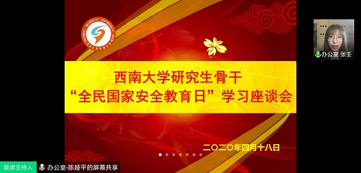 2020年4月15日是第5个“全民国家安全教育日”,为增强总体国家安全观普及力度,推动国家安全宣传教育工作深入开展,增强研究生骨干的国家安全意识,在党委研工部指导下,4月18日下午,betway西汉姆联研究生骨干“全民国家安全教育日”学习座谈会通过腾讯会议顺利召开,校研会主席团及部门负责人、各二级研会主席团代表参会,会议由校研会办公室负责人张壬同学主持。