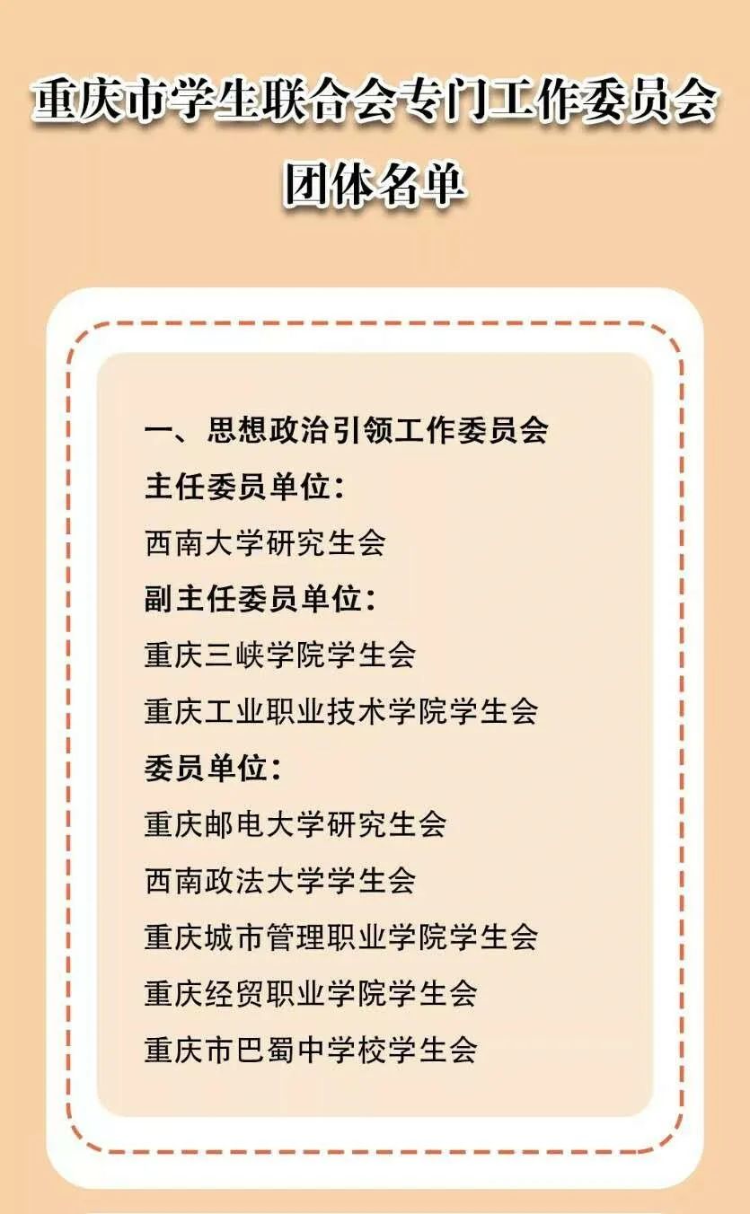 本次成立的市学联专门工作委员会作为市学联领导下的工作机构,执行市学联委员会和主席团的决议决定,依照自身职能以市学联名义开展工作。共设有思想政治引领工作委员会、学术与科技创新工作委员会、校园文化建设工作委员会、创业与就业工作委员会、社会实践与志愿服务工作委员会、权益维护与普法工作委员会、宣传与舆情工作委员会等7个专门工作委员会。校研究生会当选为思想政治引领工作委员会主任委员单位,责任重大,使命光荣。