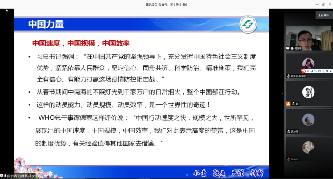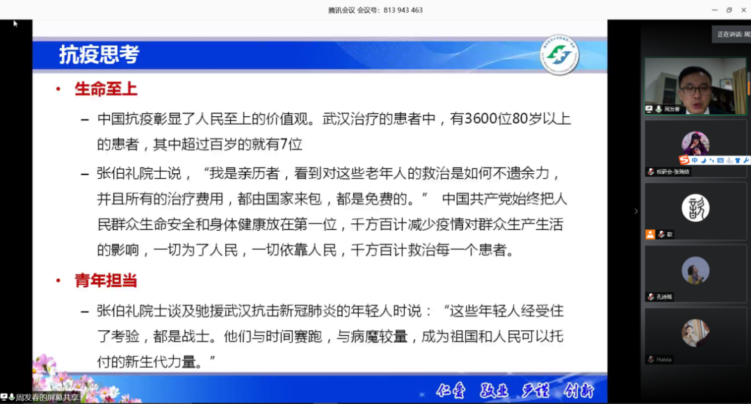 紧接着,周教授从“苟利国家生死以,岂因祸福避趋之”、“生命至上”和“青年担当”几个方面简要分享了自己在这次抗疫之中的感悟与思考。