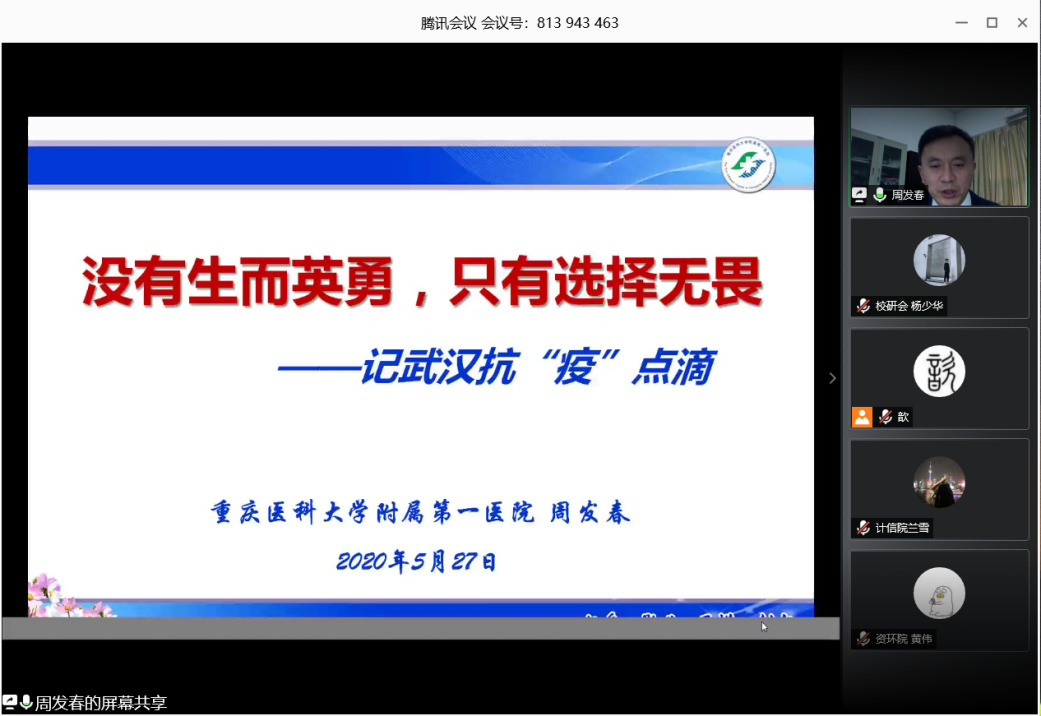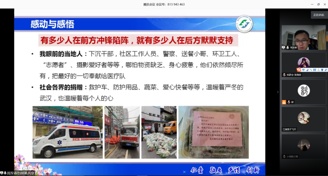 在本场直播讲座中,周发春教授从“医疗队人员情况”、“开展抗‘疫’工作”、“迎难而上的感悟”、“教学、科研与交流”和“‘新冠’科普”五个方面生动讲述了战“疫”前线的工作与感悟。