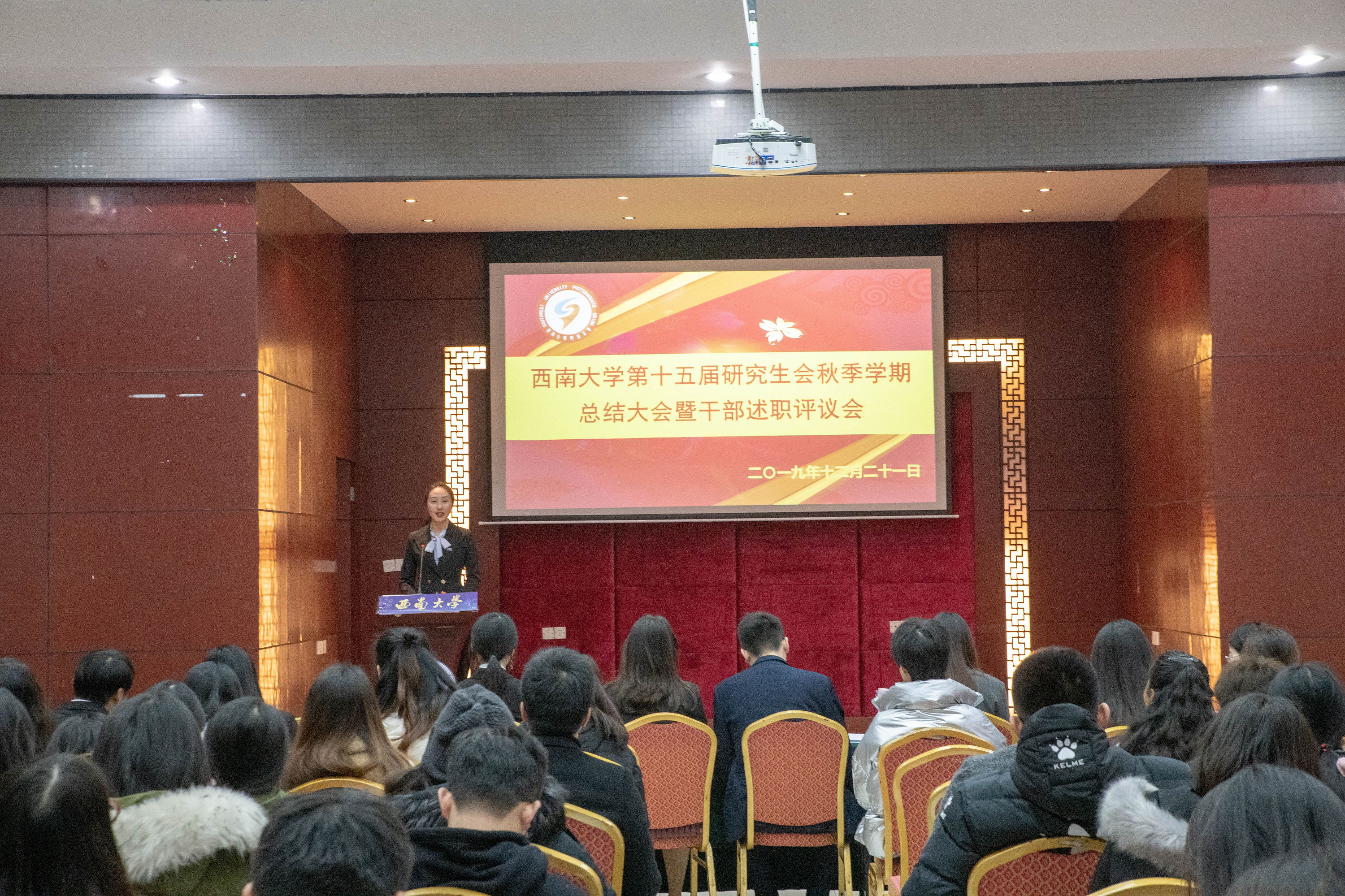 12月21日中午,学校第十五届研究生会秋季学期总结大会暨干部述职评议会于八一礼堂召开,校研会全体成员共130余人参会,会议由校研会副主席肖程钱同学主持。
