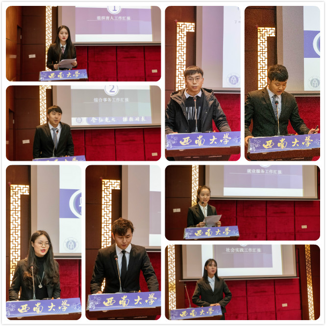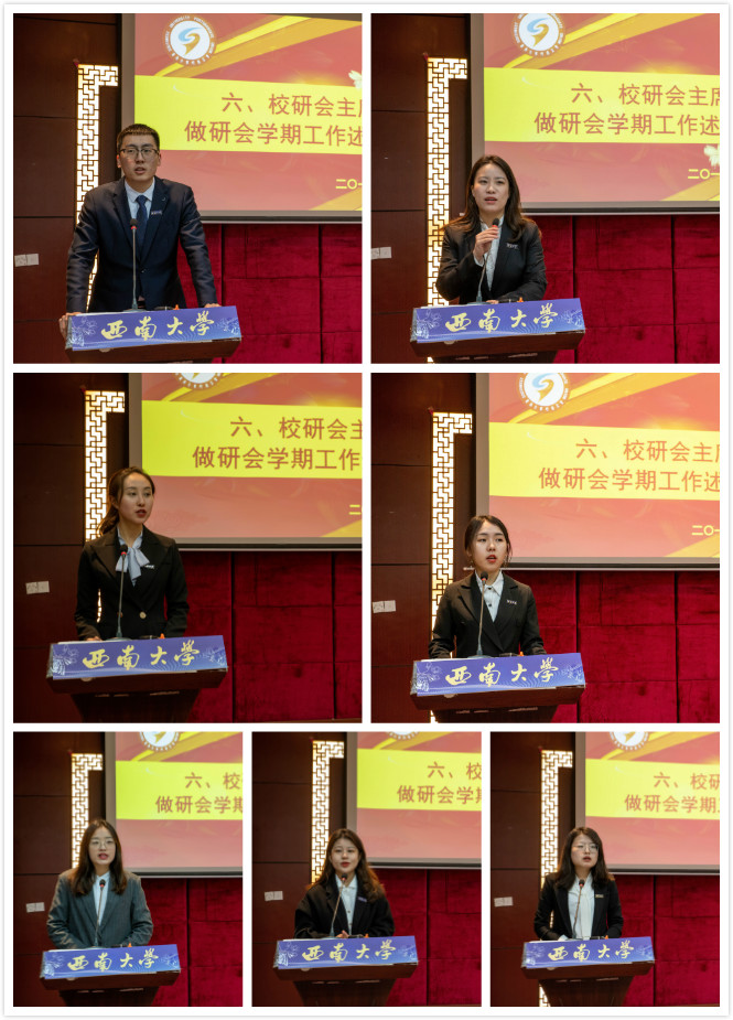 紧接着,校研会部长团成员依次从组织育人、综合事务、校园学术、校园文化、干部培训、舆情调研、就业服务和社会实践八大板块对本学年秋季学期各部门的工作进行了总结并对下学期的部门工作提出展望。他们充分展示了本学期第十五届校研会全体成员的工作情况与承办的所有活动取得的显著成果,这些骄人的成绩离不开领导老师的谆谆指导与肯定,离不开各个部门联动与配合,更离不开所有校研会成员的勤劳付出与默契合作。