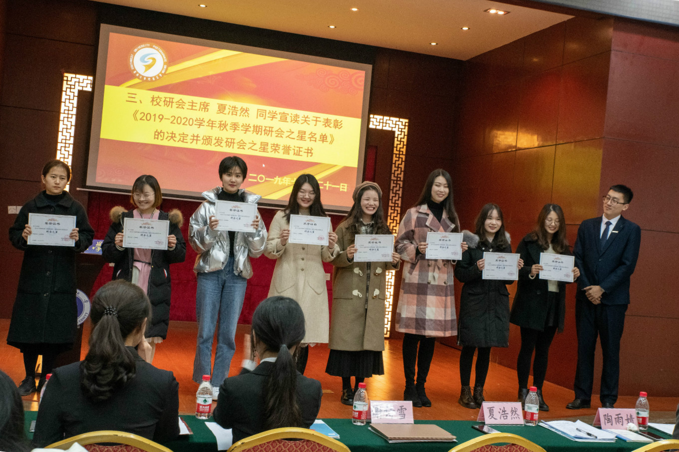 校研会主席夏浩然同学宣读了《2019-2020年秋季学期“研会之星”名单》,并为表彰的八名“研会之星”颁发荣誉证书。