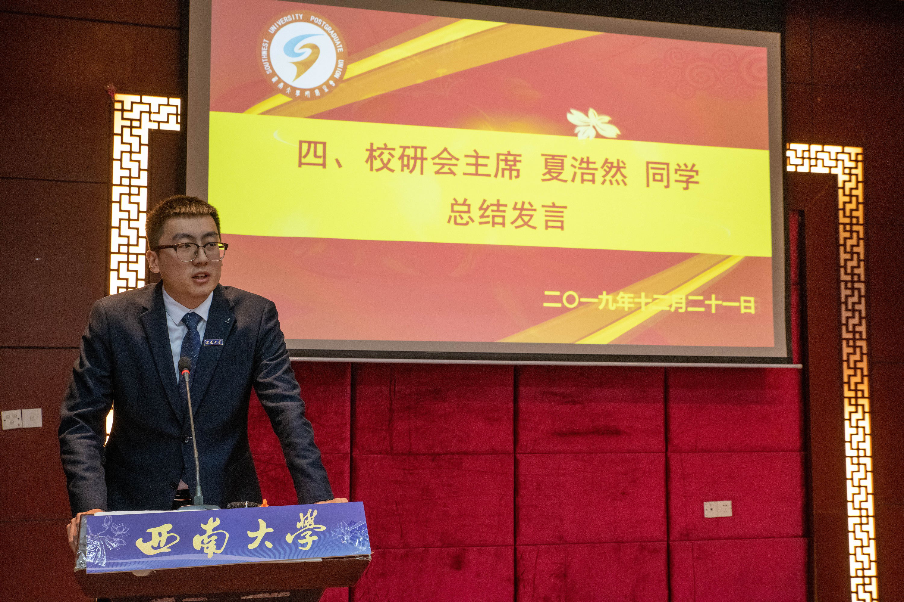 随后,校研会主席夏浩然同学作了本学期研会工作报告,他从理想、心态、发现、变革、提升、细节六个关键词高度总结和提炼了本学期各项工作内容。第一,要有“研会之星”的理想追求,“研会之星”不仅代表了本学期在研会所做工作的努力,也代表对自己工作的肯定;第二,始终保持学习的心态。在与其他高校研会交流时发现我们仍存在不足,要不断地学习前进,同时对已实现的成果也要予以肯定;第三,无论是在研会,还是在未来的学习、生活中,每个人都要有清晰的计划和认识,才能有效地推进每一个环节;第四,要精简研会组织建构,秉持五名主席、五个中心、述职评议制度、60人、学习成绩30%、二级研会参与;第五,中期选举的选举范围将扩大至全校研究生并提高筛选条件,旨在提高研会的组织人员水平;第六,本学期结束后,希望研会全体同仁将本学期的各项总结工作圆满完成并做好工作总结,工作文件整理归档,为日后的研会工作提供资料。