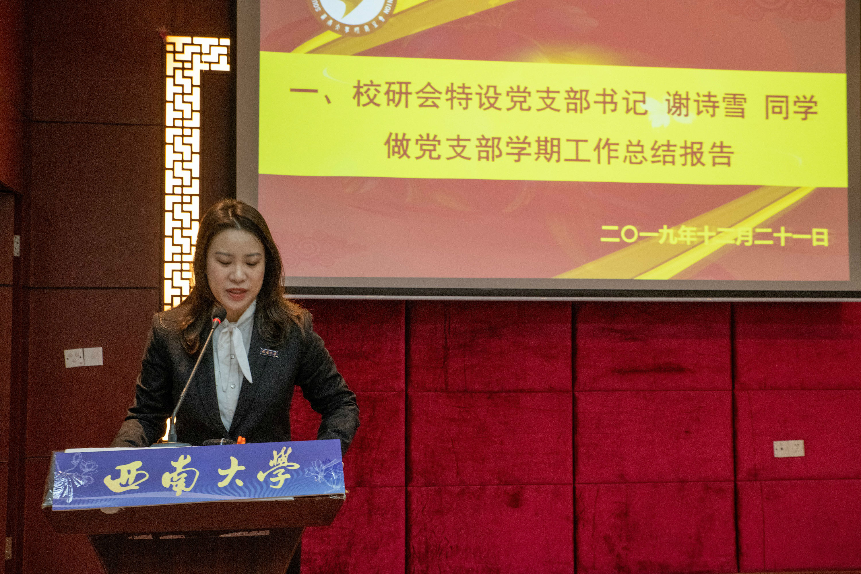 会议伊始,校研会特设党支部书记谢诗雪同学进行了党支部学期工作总结报告。她从完善支部建设、加强理论学习、紧抓骨干培养三个方面总结了支部在本学期的工作。谢诗雪同学总结道,本学期支部基本完成支部建设任务,深入宣传习近平新时代中国特色社会主义思想,广泛开展“不忘初心,牢记使命”教育活动,引导研究生坚定思想理念,但仍需继续努力改善。她呼吁校研会全体成员把握机遇,与时俱进,肩负起时代赋予我们的光荣使命,发挥带头模范作用,引领身边同学树立人生目标,为党和国家做出更多、更大的贡献。