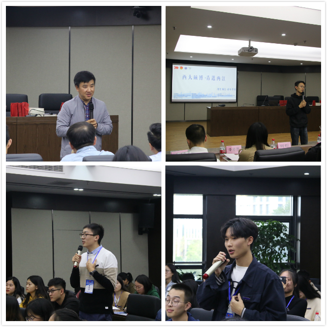 参观活动结束后,一行人来到两江新区数字经济产业园报告厅,参加“青进两江”创新创业论坛。论坛伊始,本次活动的带队老师吴睿代表学校党委研工部向两江新区团工委表示感谢,他谈到,本次参访活动为研究生同学们提供了良好的学习机会,研究生阶段的学习不应只在“象牙塔”里,应当牢记总书记的嘱咐,“把论文写在祖国大地上”,将自己的个人发展与人民的需要、社会的进步紧紧地融合在一起。紧接着,重庆五生信息技术有限公司CEO兼联合创始人刘渝、聚土网联合创始人兼副总裁黄祖舸两位特邀嘉宾为同学们带来精彩的报告,他们分享了自己的创业经历,并与在场同学进行频频互动,犀利的提问,见解独到的回答将论坛推向了高潮。最后,两江新区团工委书记范宇作总结讲话,他指出,两江新区作为中国内陆第一个国家级开发开放新区,各类人才特别是技能人才需求日益增长,欢迎西大学子毕业以后能够投身两江新区,在这片热土创业就业,在这里收获属于自己的青春励志故事,共同推进内陆开放高地建设。