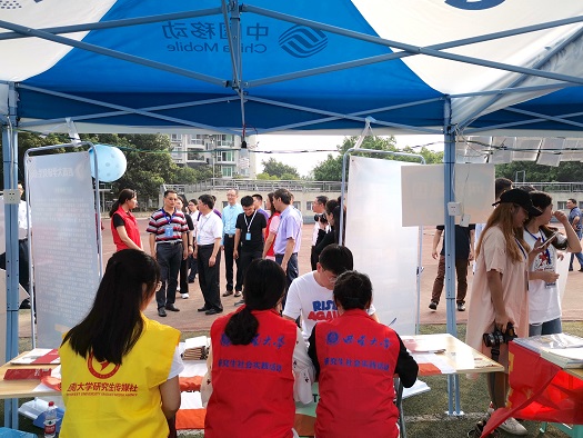 在现场迎新人员的带领下,李书记一行人走近校研究生会迎新摆点现场与工作人员进行亲切交谈,认真了解了新生报到和研会纳新的情况以及指导解决在迎新工作中遇到的问题,并对迎新工作人员的工作态度,良好的精神风貌和热忱的服务表示赞扬。尹部长亲切询问前来咨询的新同学,是来自哪个学院,新宿舍环境是否满意,能否适应这里的新生活等,这位新同学也热情回应,一一回答。