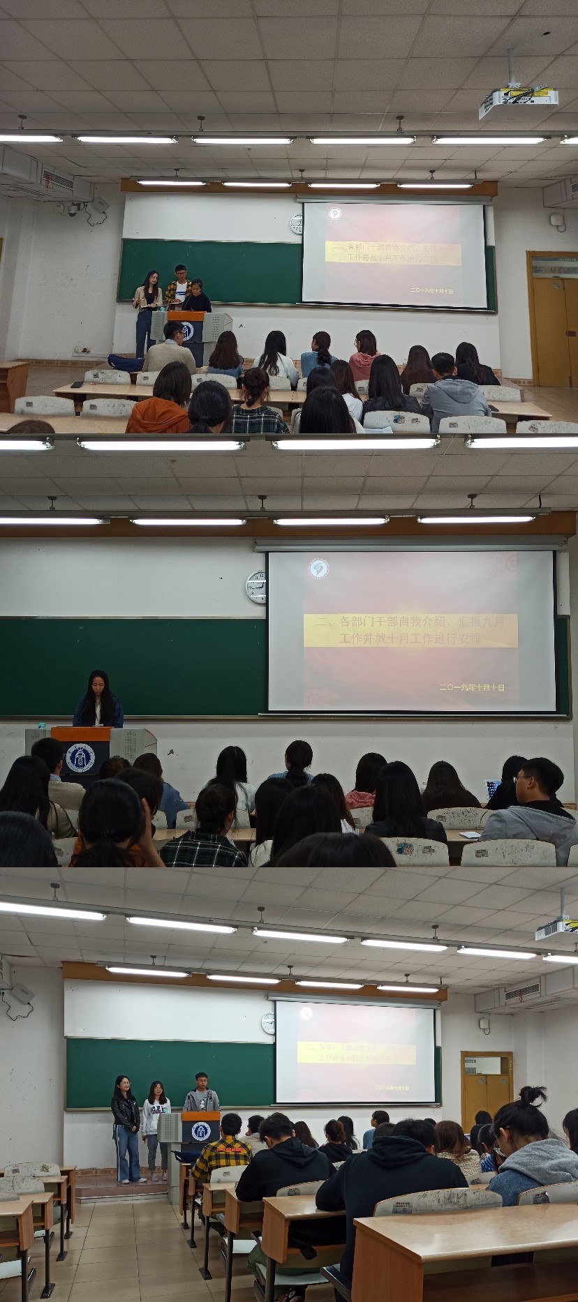 随后,各部门干部依次进行自我介绍、总结汇报九月工作并就十月工作进行安排。九月,各部门团结协作已顺利完成了研会纳新、制度完善、工作计划制定等各项工作,十月还将继续开展两江新区参访、调研、招聘会筹备、内部素质拓展、暑期社会实践评优等工作事宜。