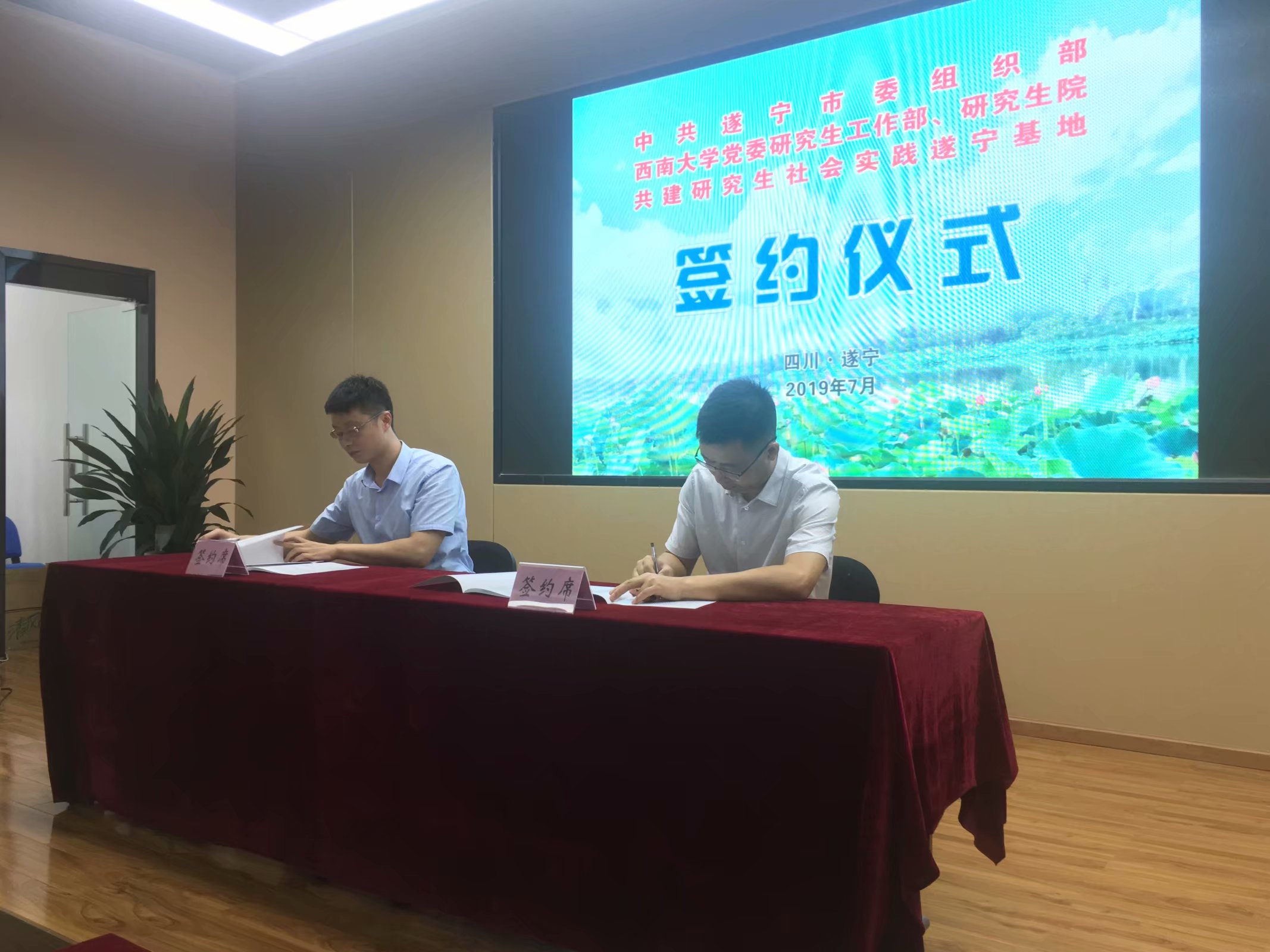7月15日,学校党委研究生工作部、研究生院与中共遂宁市委组织部共建研究生社会实践遂宁基地签约仪式于遂宁观音湖畔顺利举行。研究生院院长赵国华、研工部副部长胡娟、研究生院就业创业科科长胥宏祥、中共遂宁市委组织部副部长梁识栋、遂宁市人才办公室主任李鸿桀、遂宁市实践接收单位相关负责同志以及betway西汉姆联参与实践的全体研究生出席签约仪式,遂宁市体育局党组成员、副局长邓磊主持本次仪式。