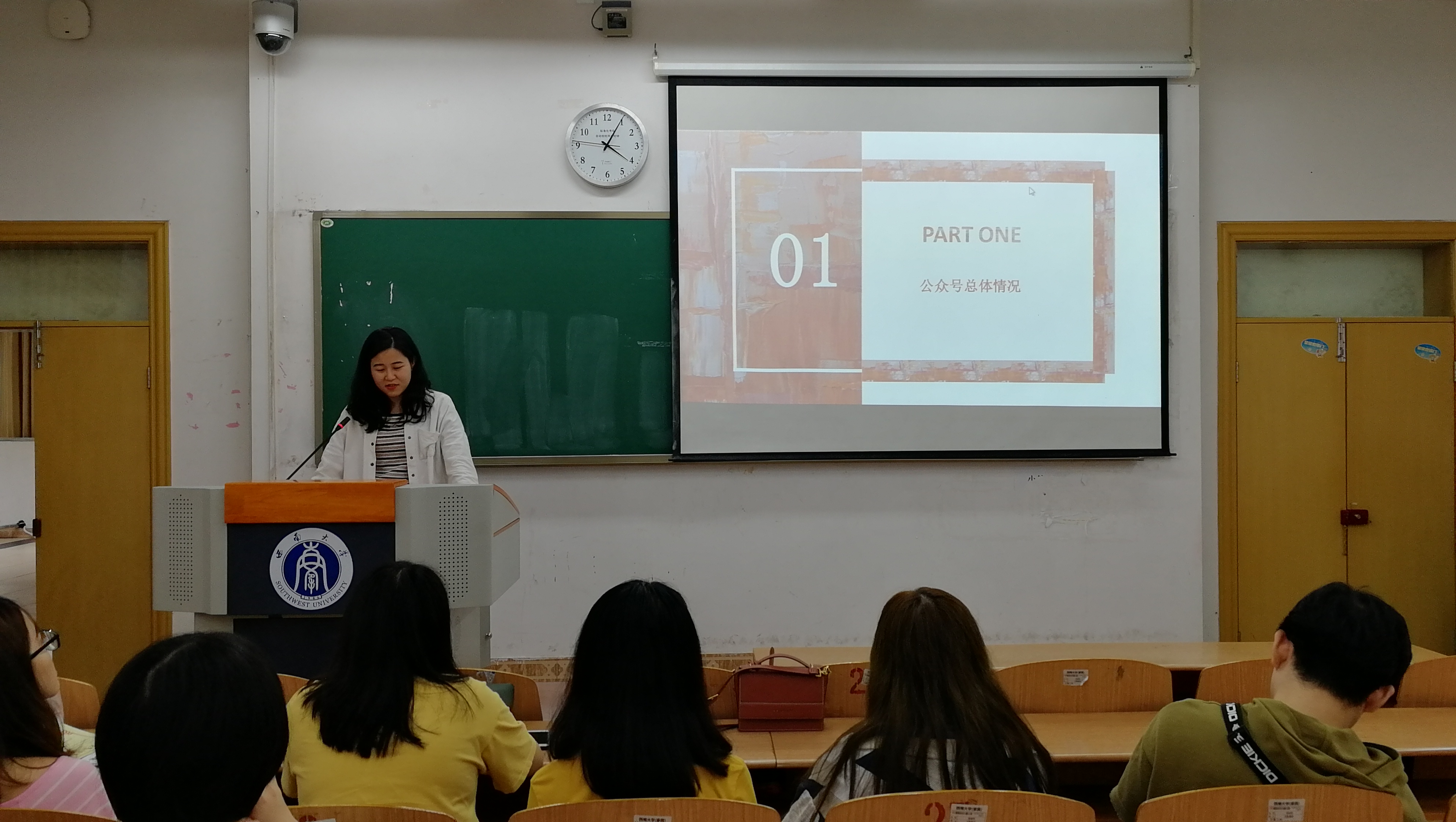 会上,总监助理辛正琦同学重点就本学年微信运营的总体情况进行了总结,她分别从推文学年成果、推文内容、质量以及特色栏目等方面对整体情况作了一一介绍,肯定了大家一年多的付出,也指出今后微信要增加与研究生密切相关的文章推送,多出一些“干货”。在微博运营方面,她提到之后可以采取Vlog、微信链接等多种形式加强微博宣传力度,并紧紧围绕研究生生活。