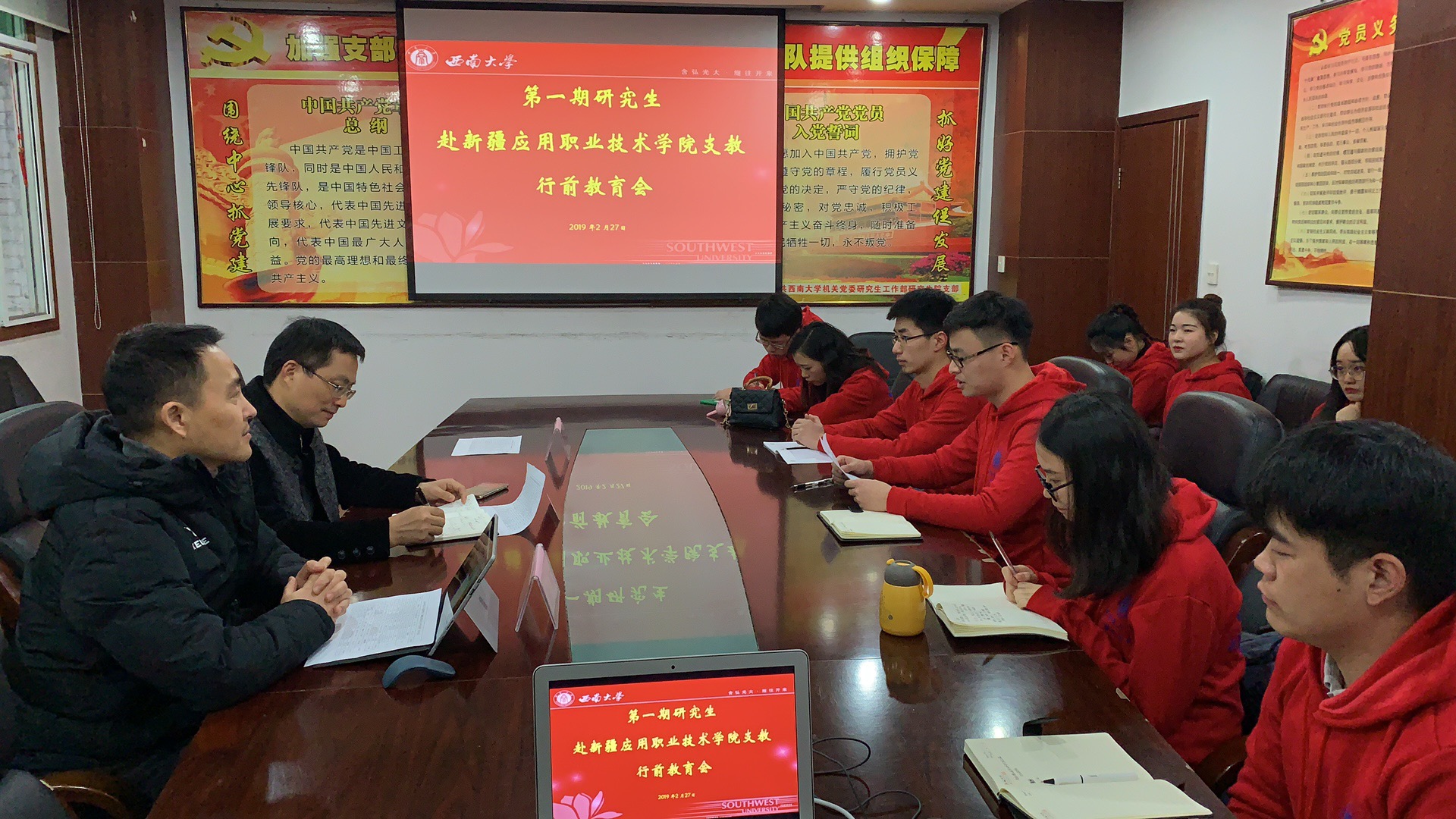 2月27日,第一期研究生赴新疆应用职业技术学院支教行前教育会在研究生院二楼会议室顺利举行,党委研究生工作部部长尹晓东、研究生院院长赵国华、研究生院副院长涂涛及支教团全体成员参加了会议,会议由党委研究生工作部思政办主任吴睿老师主持。