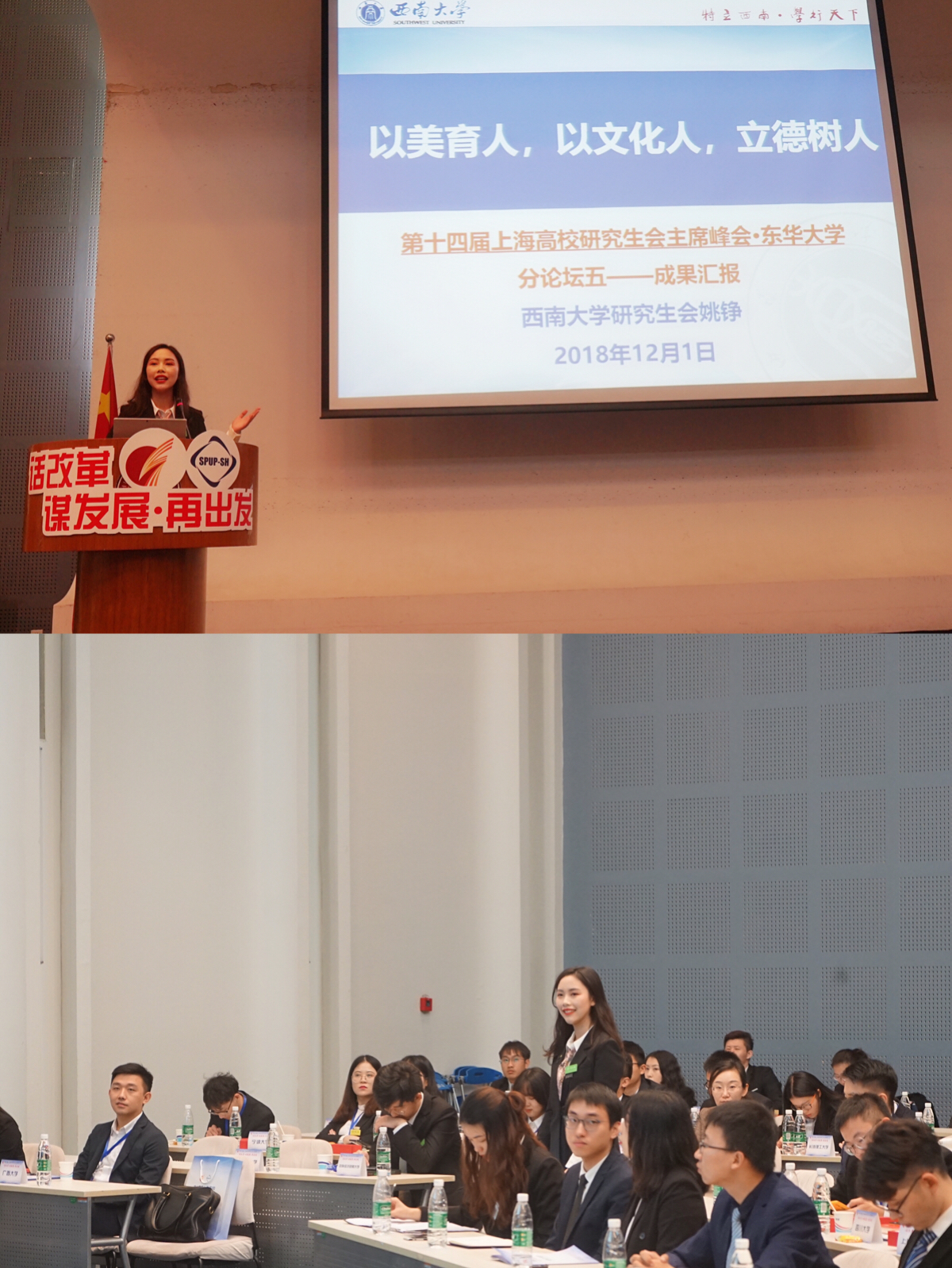 11月30日-12月1日,我校研究生会主席姚铮同学、副主席杨希同学应邀出席由共青团上海市委员会指导、上海市学生联合会主办、东华大学研究生会承办的第十四届上海高校研究生会主席峰会。本届峰会以“话改革·谋发展·再出发”为主题,复旦大学、厦门大学、东南大学等共计70所高校的140余名研究生会代表与会,共话改革、共谱新篇!