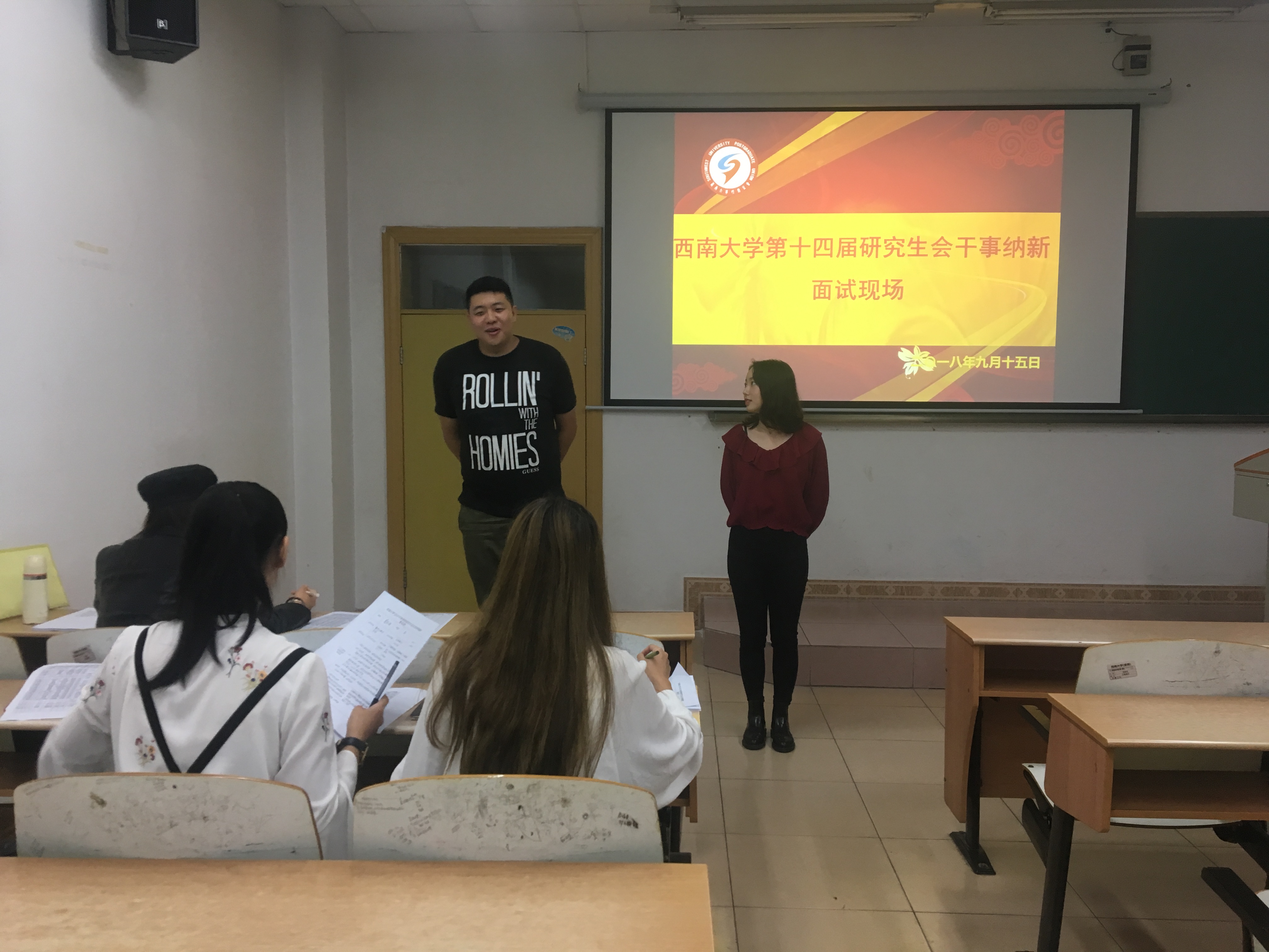 9月15日上午,学校研究生会第十四届干事纳新活动在八教107教室举行。此次纳新活动是为了给2018级新生提供一个锻炼自我、展示自我、提升自我的平台,同时也为学校研究生会队伍充实优秀人才,确保学生工作的良性发展。